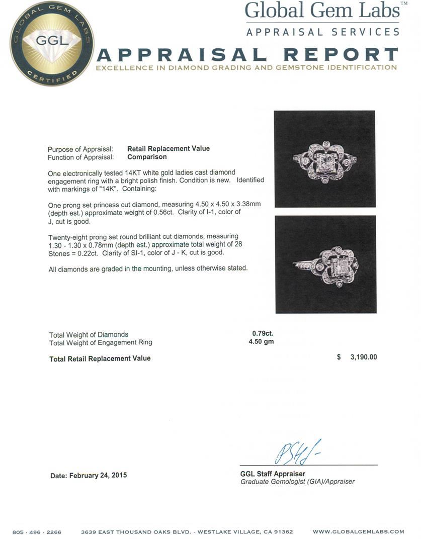 One electronically tested 14KT white gold ladies cast diamond engagement ring with a bright polish finish. Identified with markings of "14K". Condition is new. Containing: One prong set princess cut diamond, measuring 4.50 x 4.50 x 3.38mm (depth est.) approximate weight of 0.56ct. Clarity: I-1. Color: J, Cut is Good. Twenty-Eight prong set round brilliant cut diamonds, measuring 1.30 - 1.30 x 0.78mm (depth est.) approximate total weight of 28 Stones = 0.22ct. Clarity: SI-1. Color: J - K, Cut is Good. All diamonds are graded in the mounting, unless otherwise stated. Total Weight of Diamonds 0.79ct. Total Weight of Engagement Ring 4.50 grams. GGL Appraised at $3,190.00.