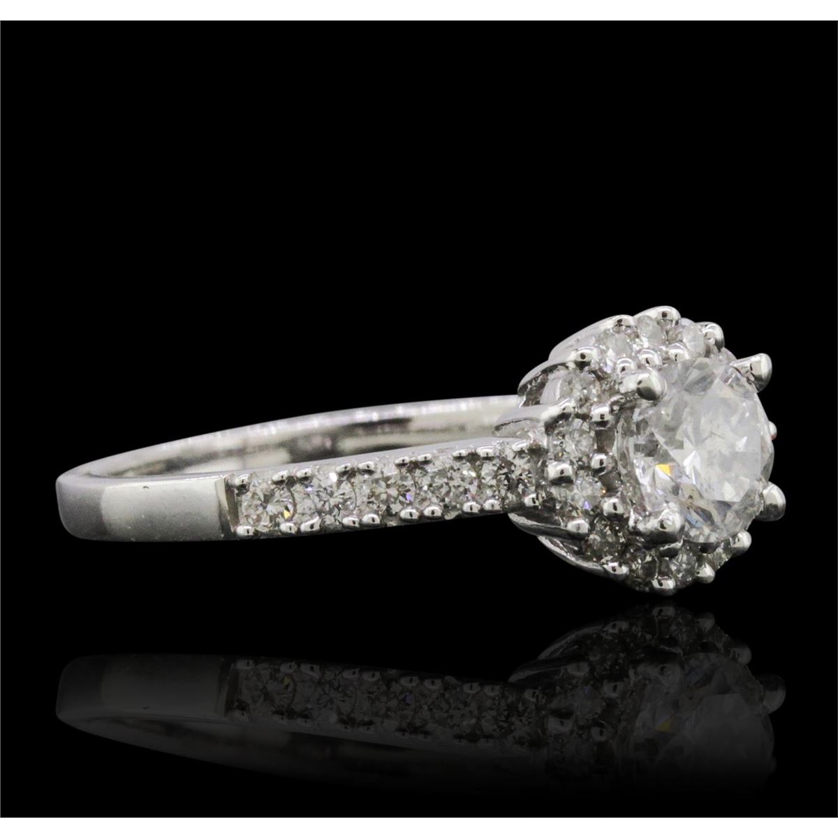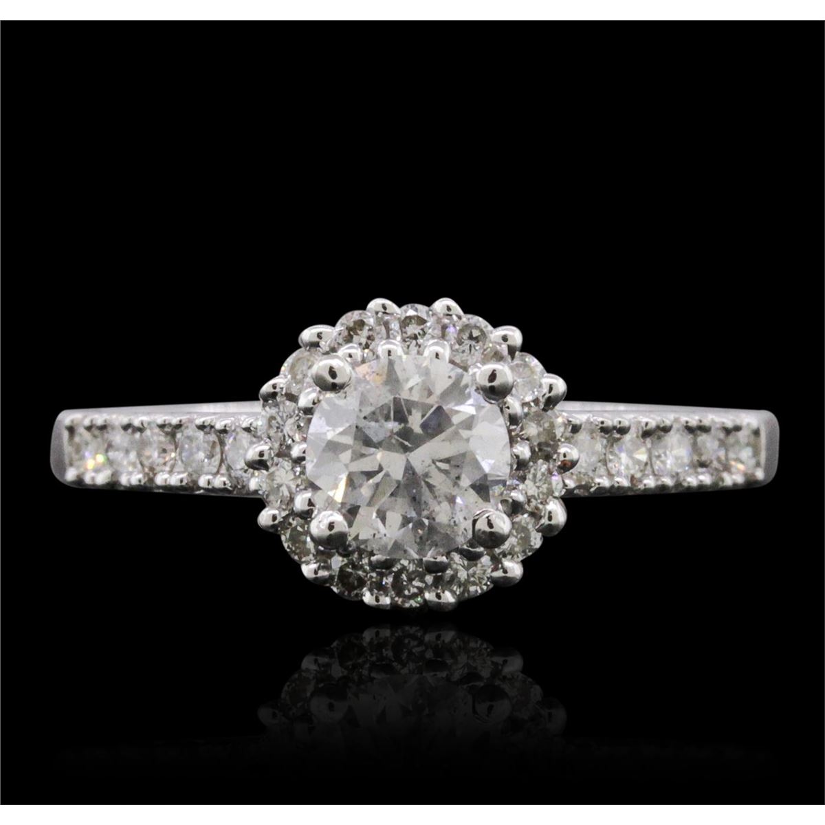 One electronically tested 14KT white gold ladies combination cast & assembled engagement ring with a flat shank with a bright polish finish. Identified with markings of "14K". Condition is new. Containing: One prong set round brilliant cut diamond, measuring 5.41 - 5.40 x 3.08mm (depth est.) approximate weight of 0.55ct. Clarity: I-1. Color: I, Cut is Good. Twenty-Four prong set round brilliant cut diamonds, measuring 1.50 - 1.30 x 0.84mm (depth est.) approximate total weight of 24 Stones = 0.24ct. Clarity: SI-2 to I-1. Color: J - K, Cut is Good. All diamonds are graded in the mounting, unless otherwise stated. Total Weight of Diamonds 0.79ct. Total Weight of Ring 3.20 grams. GGL Appraised at $5,510.00.