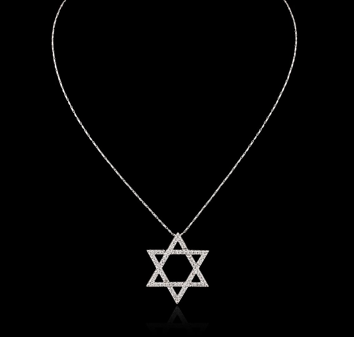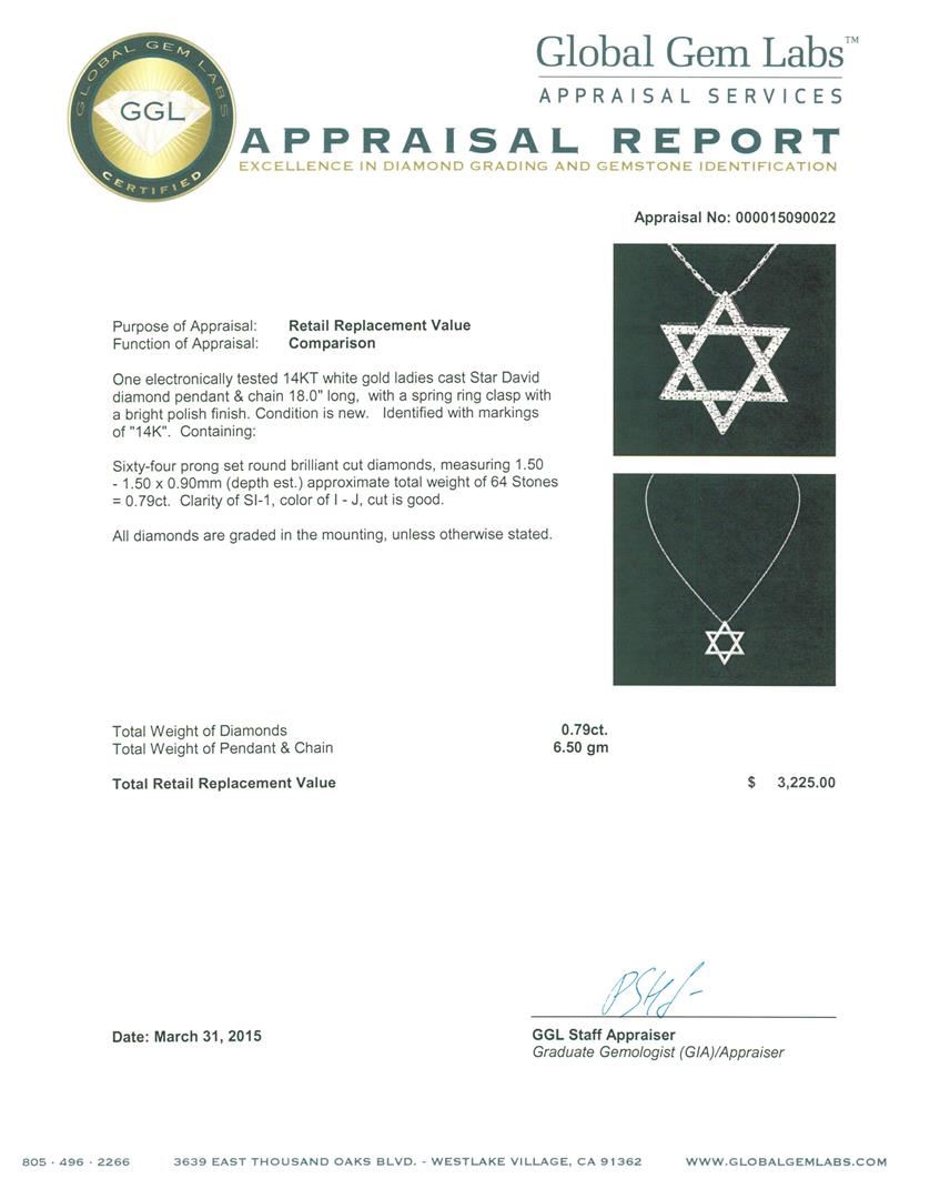 One electronically tested 14KT white gold ladies cast Star of David diamond pendant & chain 18.0" long, with a spring ring clasp with a bright polish finish. Identified with markings of "14K". Condition is new. Containing: Sixty-Four prong set round brilliant cut diamonds, measuring 1.50 - 1.50 x 0.90mm (depth est.) approximate total weight of 64 Stones = 0.79ct. Clarity: SI-1. Color: I - J, Cut is Good. All diamonds are graded in the mounting, unless otherwise stated. Total Weight of Diamonds 0.79ct. Total Weight of Pendant & Chain 6.50 grams. GGL Appraised at $3,225.00.