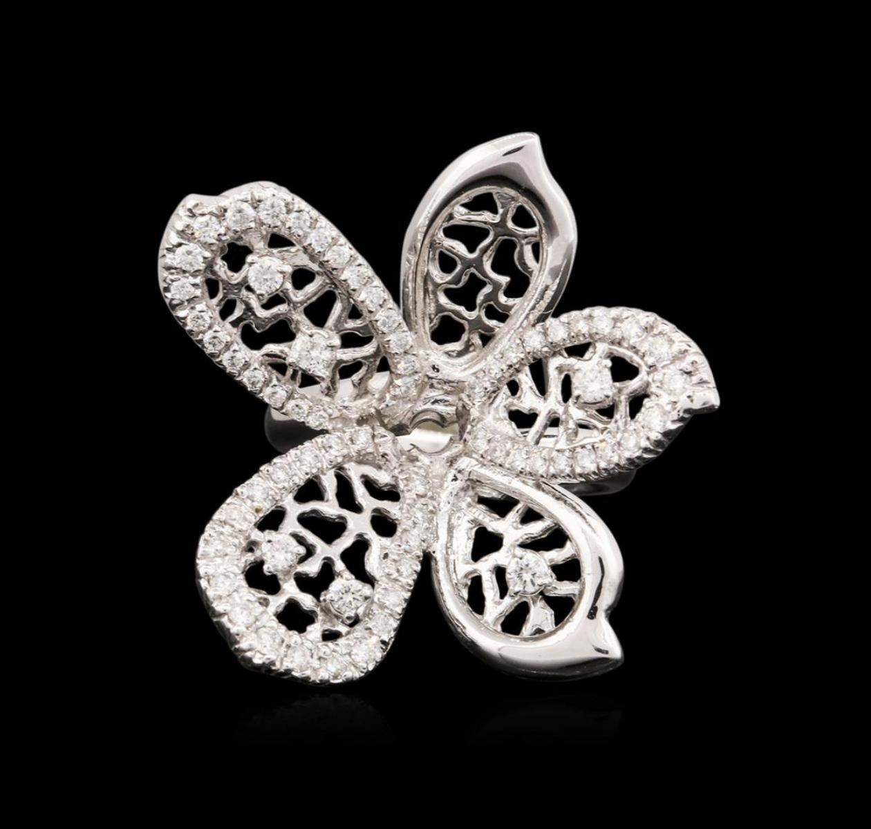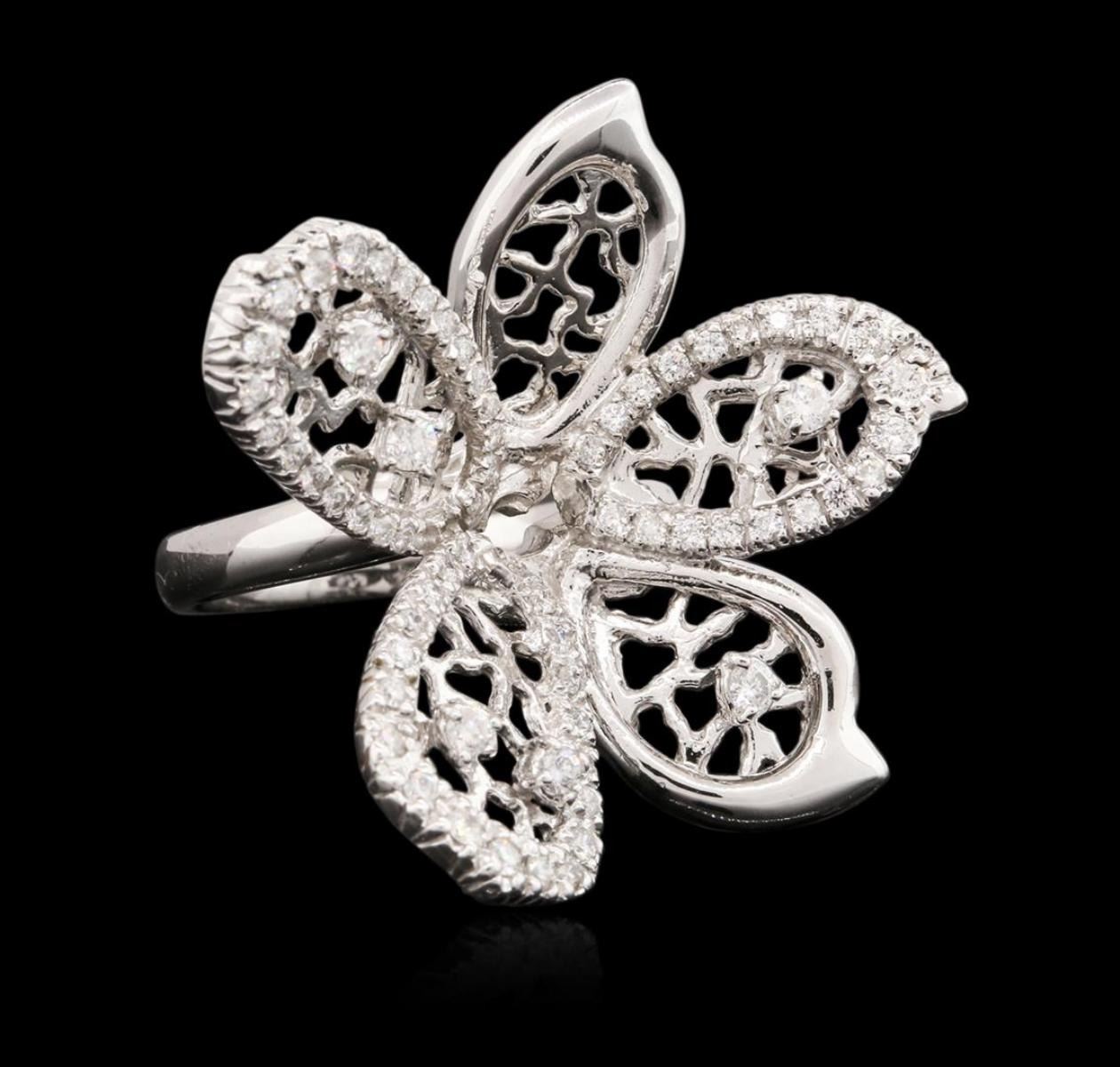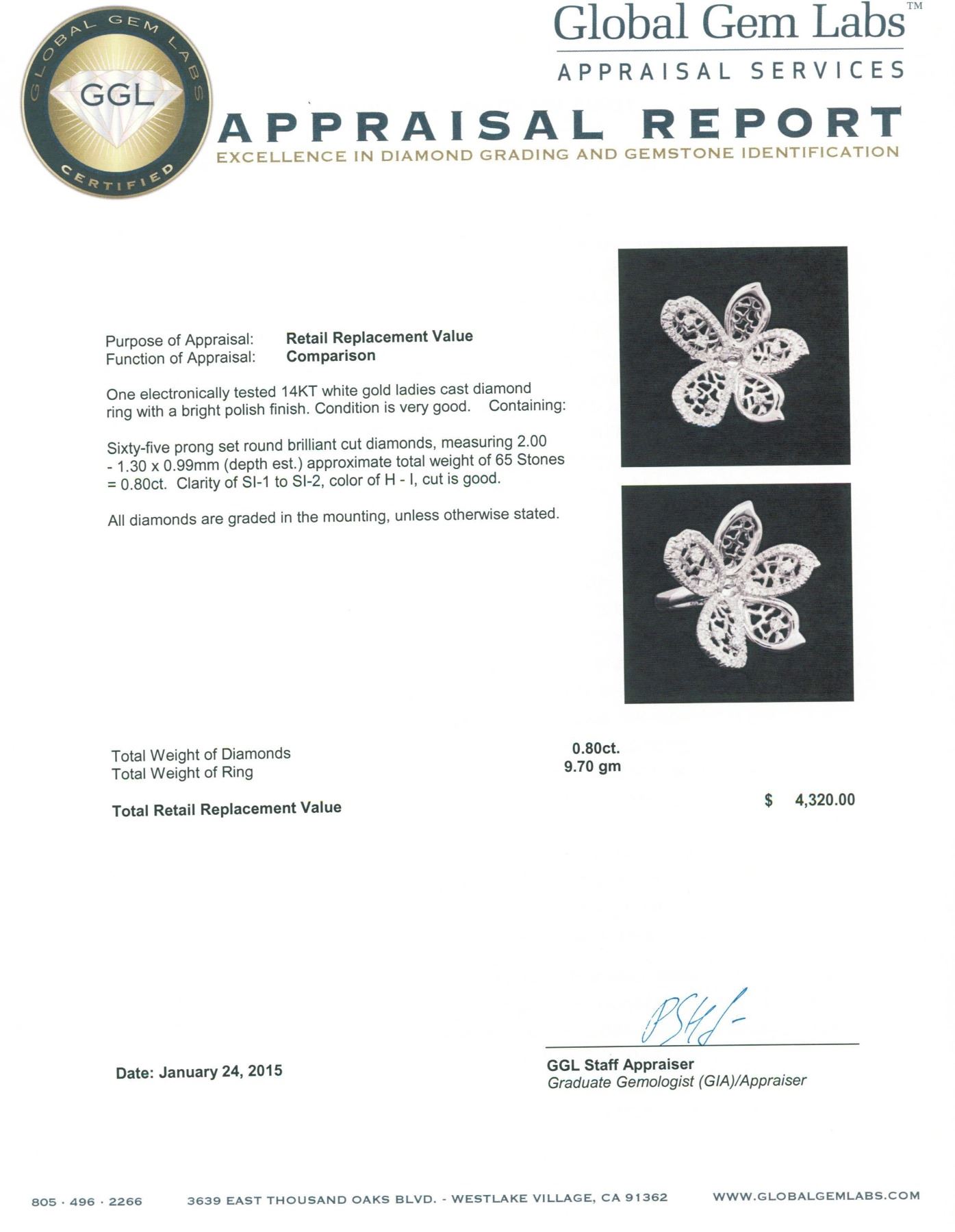 One electronically tested 14KT white gold ladies cast diamond ring with a bright polish finish. Condition is very good. Containing: Sixty-Five prong set round brilliant cut diamonds, measuring 2.00. - 1.30 x 0.99mm (depth est.) approximate total weight of 65 Stones = 0.80ct. Clarity: SI-1 to SI-2. Color: H - I, Cut is Good. All diamonds are graded in the mounting, unless otherwise stated. Total Weight of Diamonds 0.80ct. Total Weight of Ring 9.70 grams. GGL Appraised at $4,320.00.