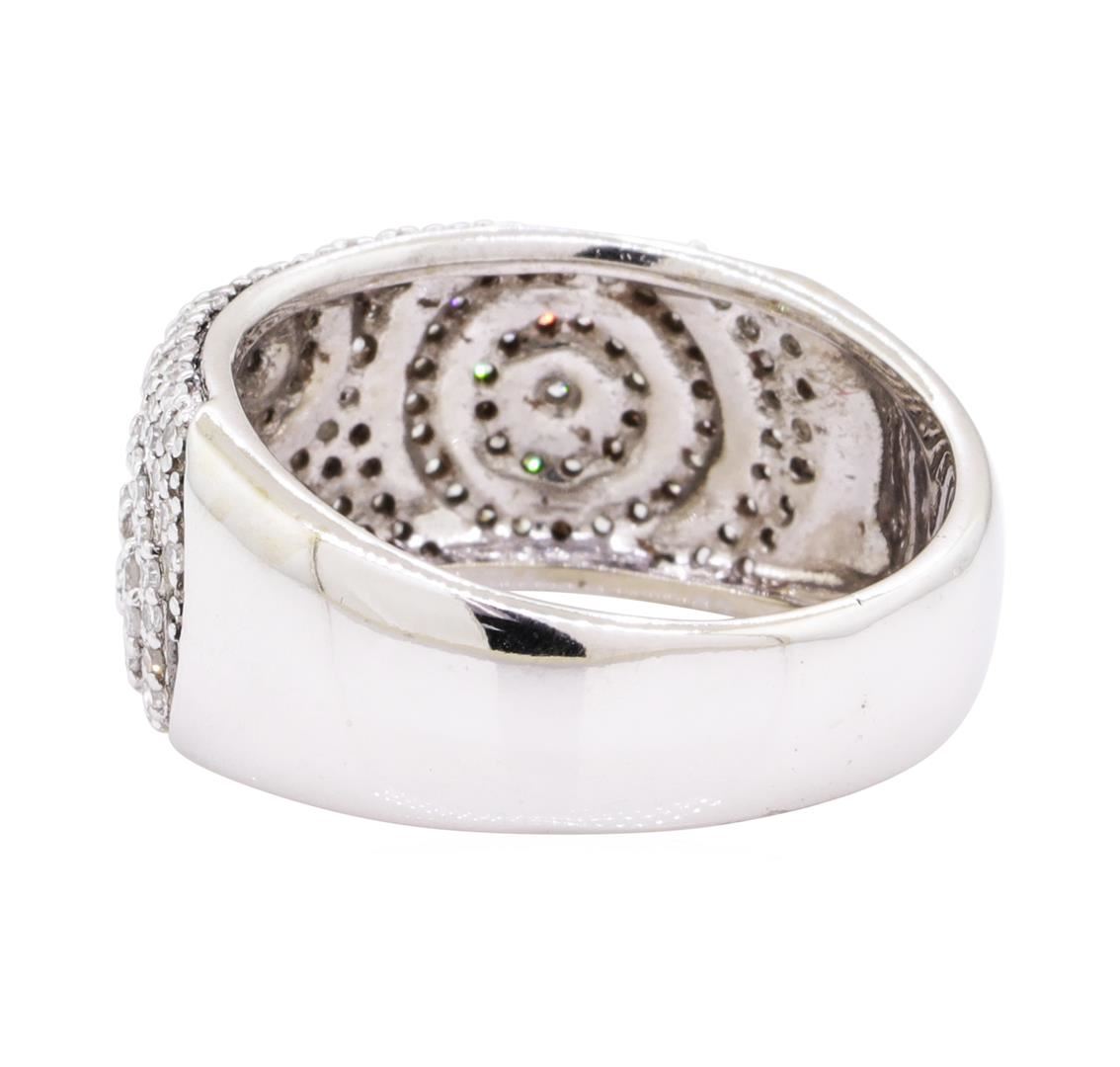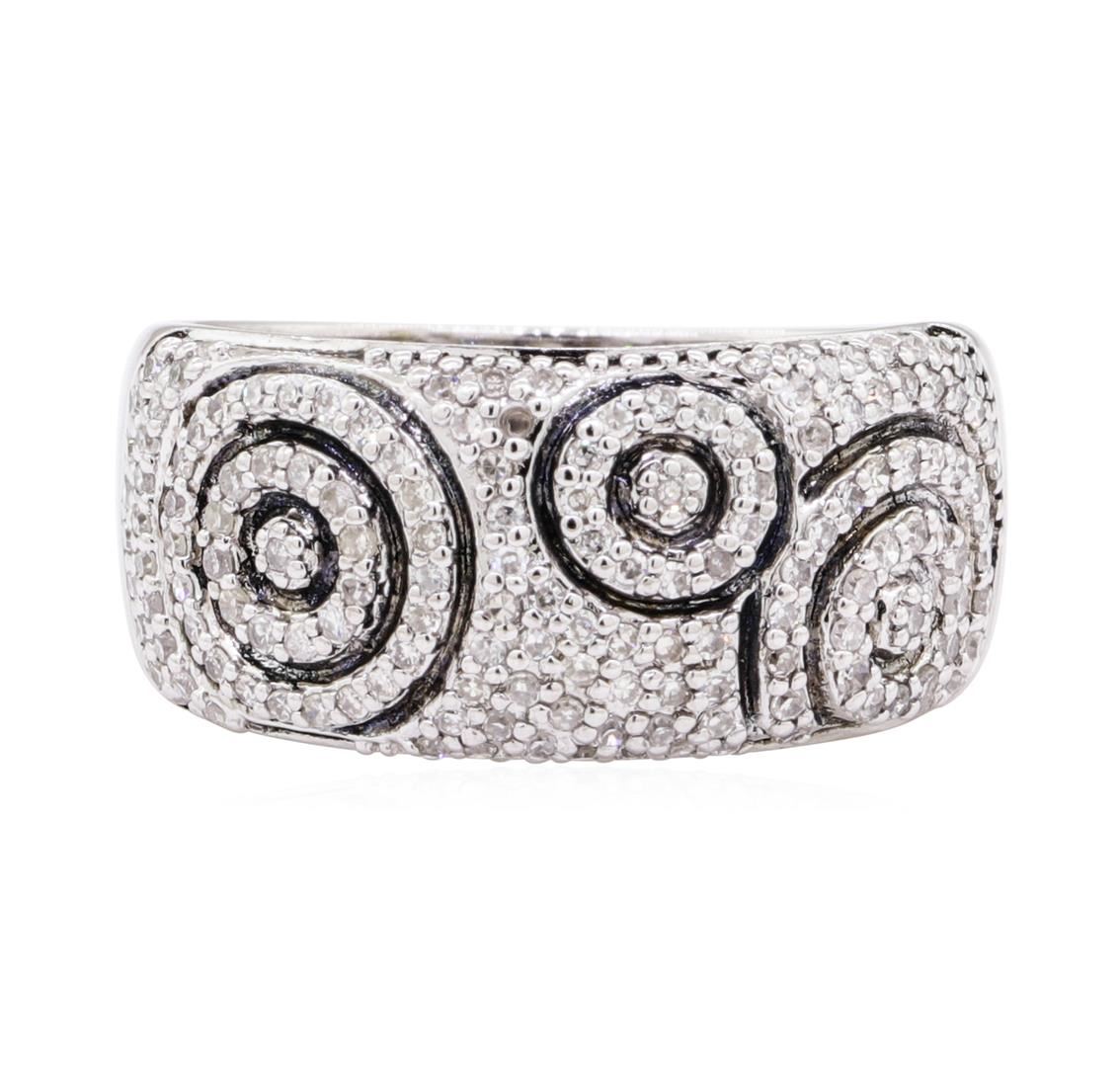 One wide band with circle motif ring featuring: 14KT white gold with black antiquing weighing 6.6 grams containing diamonds weighing 0.80ctw. The ring is a size 7.5.