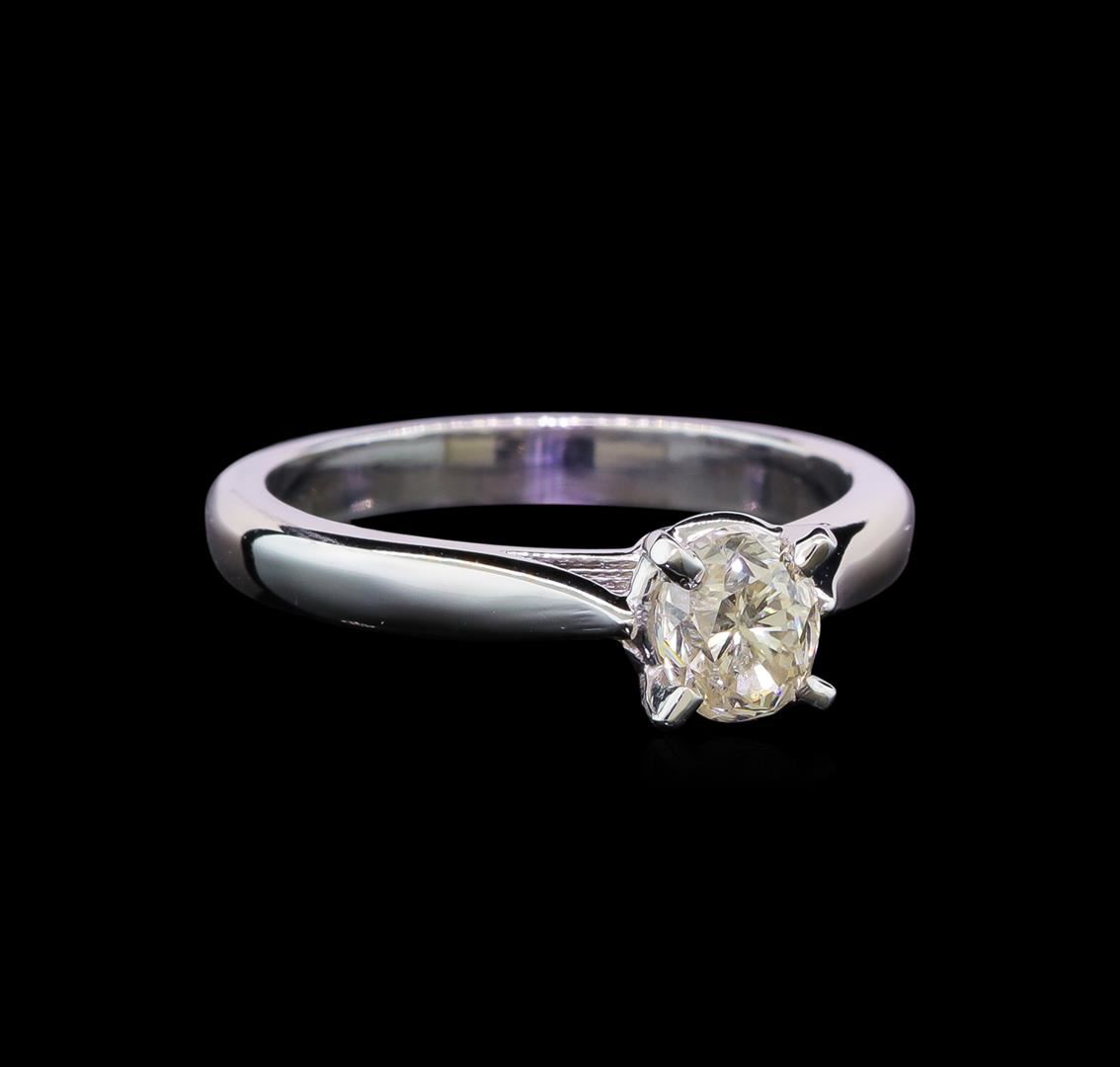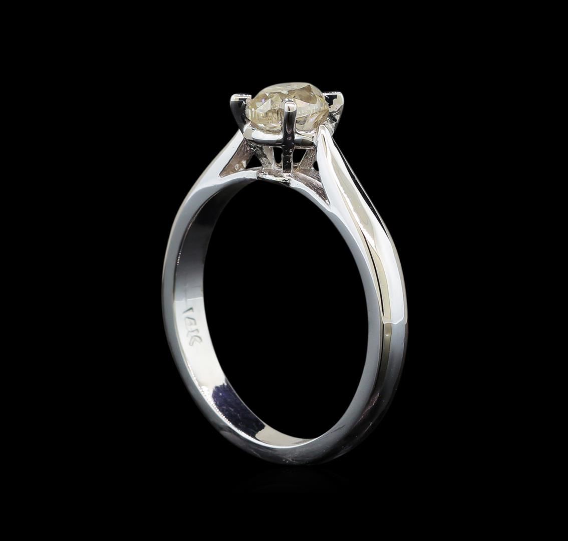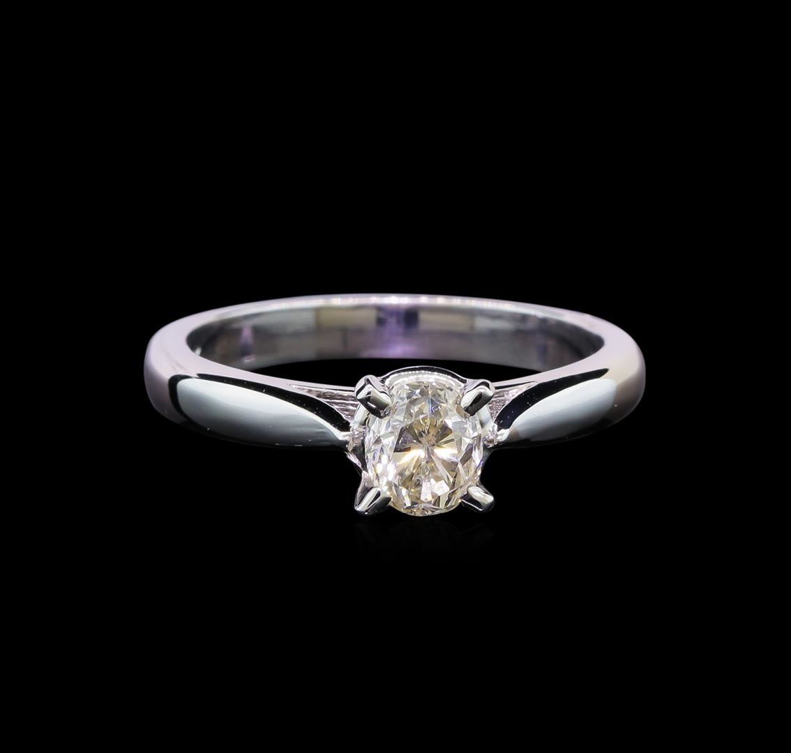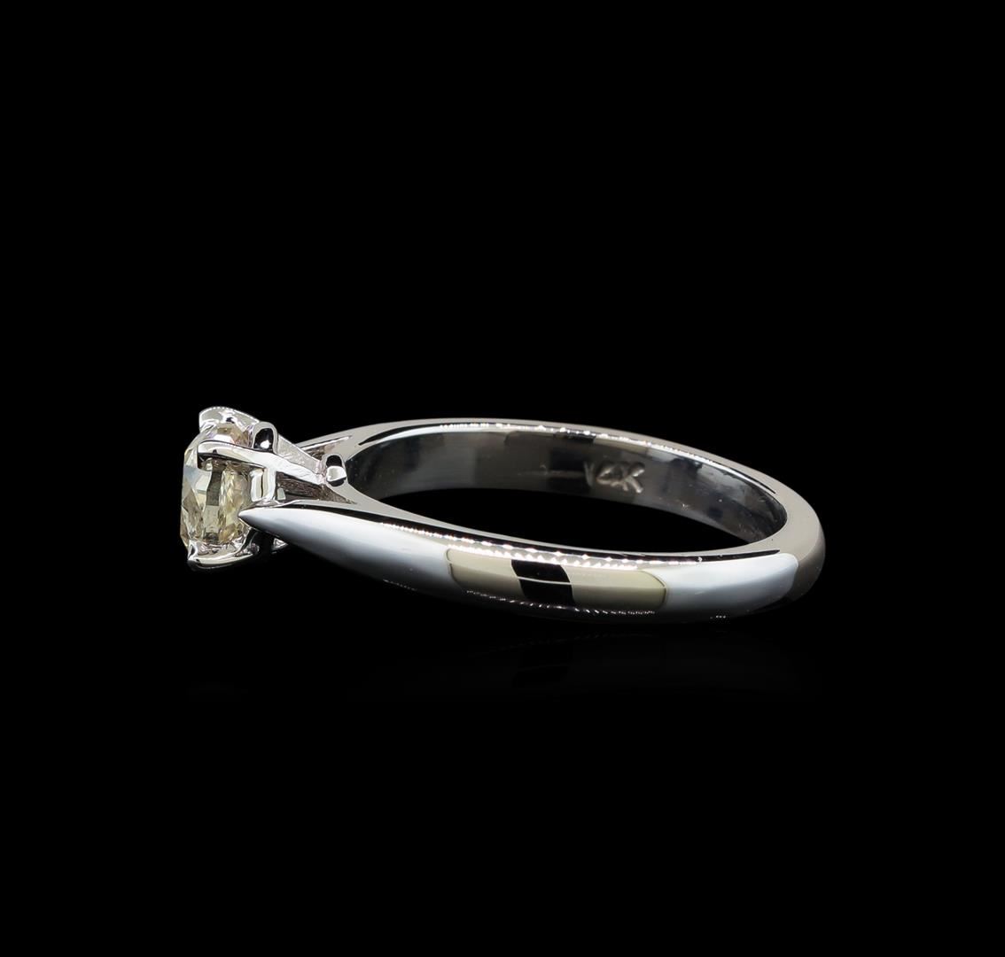 One electronically tested 14KT white gold ladies cast diamond solitaire ring with a cathedral shank with a bright polish finish. Identified with markings of "14K". Condition is new. Containing: One prong set oval shaped cut diamond, measuring 5.60 x 4.70 x 2.96mm (depth est.) exact weight 0.80ct. Clarity: I-1. Color: L, Cut is Good. Diamonds are graded in the mounting, unless otherwise stated. Total Weight of Diamonds 0.80ct. Total Weight of Solitaire Ring 3.80 grams. GGL Appraised at $2,085.00.