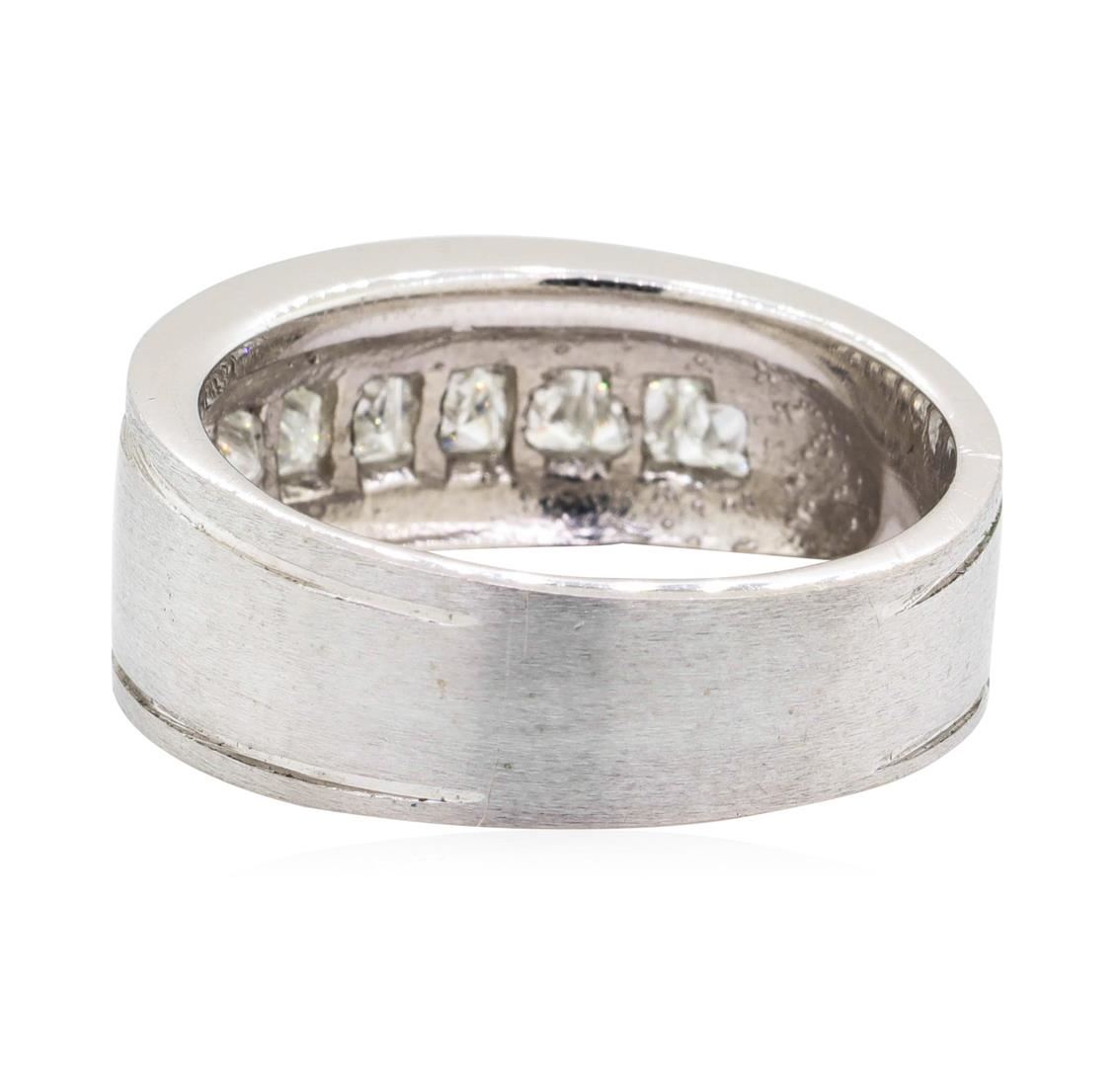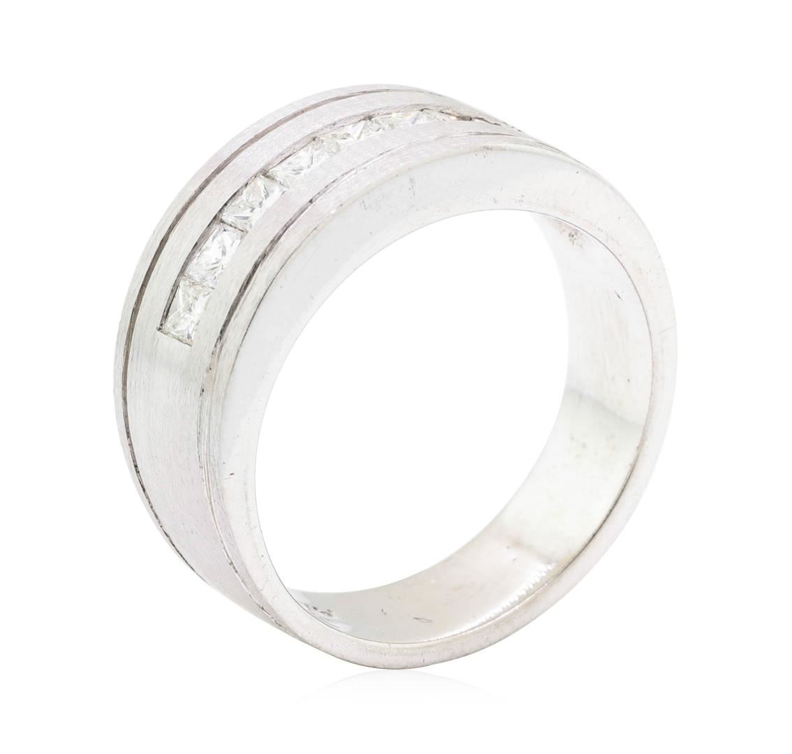 One man's ring with a satin finish featuring: 14KT white gold weighing 12.7 grams containing princess cut diamonds weighing 0.80ctw. The ring is a size 10.