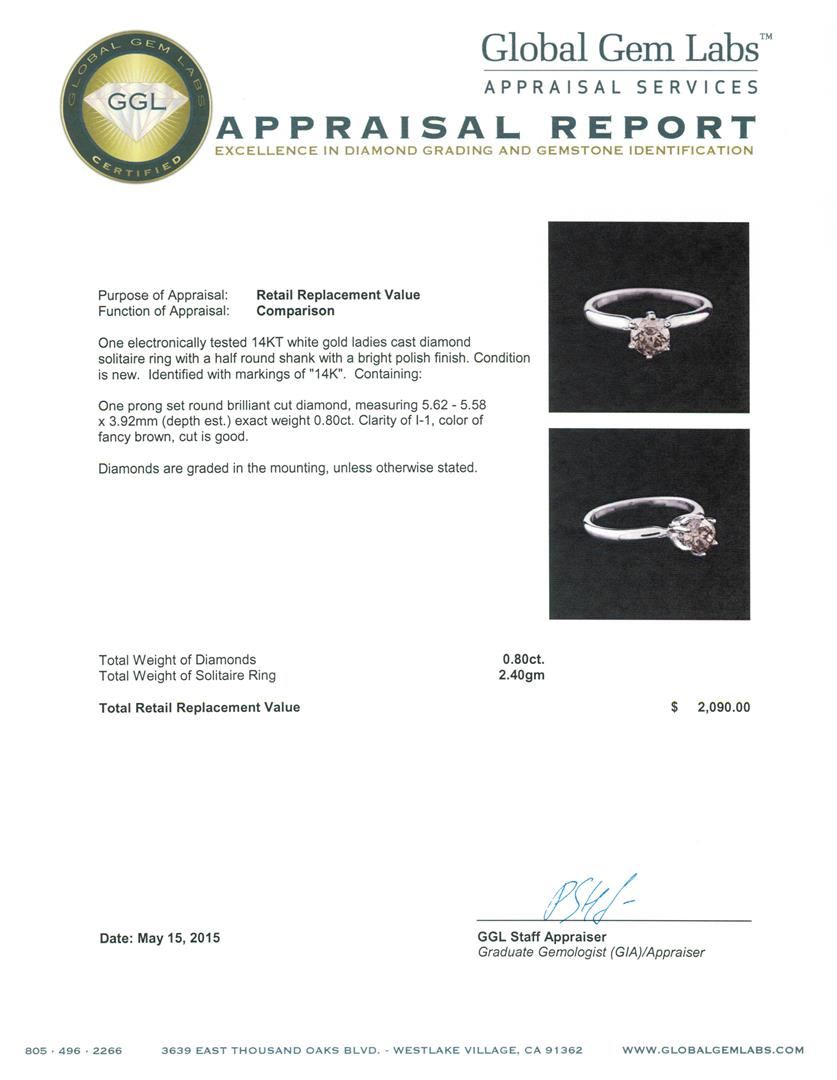 One electronically tested 14KT white gold ladies cast diamond solitaire ring with a half round shank with a bright polish finish. Identified with markings of "14K". Condition is new. Containing: One prong set round brilliant cut diamond, measuring 5.62 - 5.58 x 3.92mm (depth est.) exact weight 0.80ct. Clarity: I-1, Cut is Good. Diamonds are graded in the mounting, unless otherwise stated. Total Weight of Diamonds 0.80ct. Total Weight of Solitaire Ring 2.40 grams. GGL Appraised at $2,090.00.