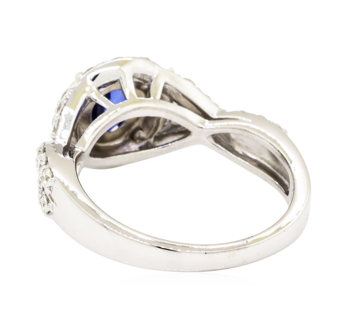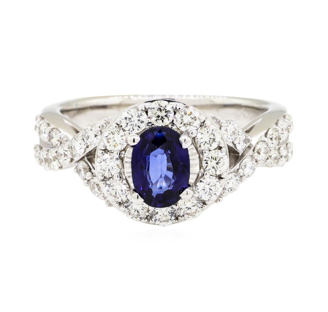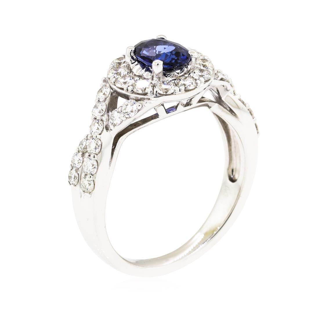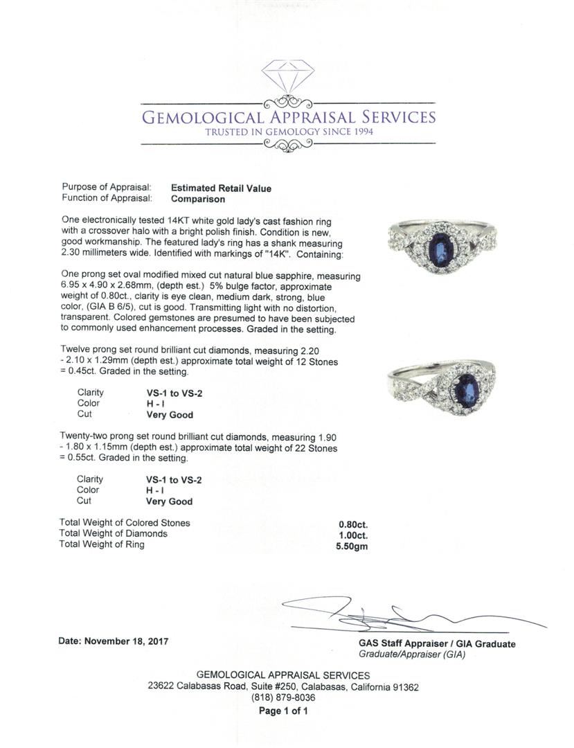 One electronically tested 14KT white gold lady's cast fashion ring with a crossover halo with a bright polish finish. The featured lady's ring has a shank measuring 2.30 millimeters wide. Identified with markings of '14K'. Condition is new, good workmanship. Containing: One prong set oval modified mixed cut natural blue sapphire, measuring 6.95 x 4.90 x 2.68mm, (depth est.) 5%. bulge factor, approximate weight of 0.80ct., clarity is eye clean, medium dark, strong, blue color, (GIA B 6/5), cut is good. Transmitting light with no distortion, transparent. Colored gemstones are presumed to have been subjected to commonly used enhancement processes. Graded in the setting. Twelve prong set round brilliant cut diamonds, measuring 2.20 - 2.10 x 1.29mm (depth est.) approximate total weight of 12 Stones = 0.45ct. Graded in the setting. Color H - I Clarity VS-1 to VS-2 Cut Very Good Twenty-Two prong set round brilliant cut diamonds, measuring 1.90 - 1.80 x 1.15mm (depth est.) approximate total weight of 22 Stones = 0.55ct. Graded in the setting. Color H - I Clarity VS-1 to VS-2 Cut Very Good. Total Weight of Colored Stones 0.80ct.. Total Weight of Diamonds 1.00ct.. Total Weight of Ring 5.50gm. GAS Appraised.