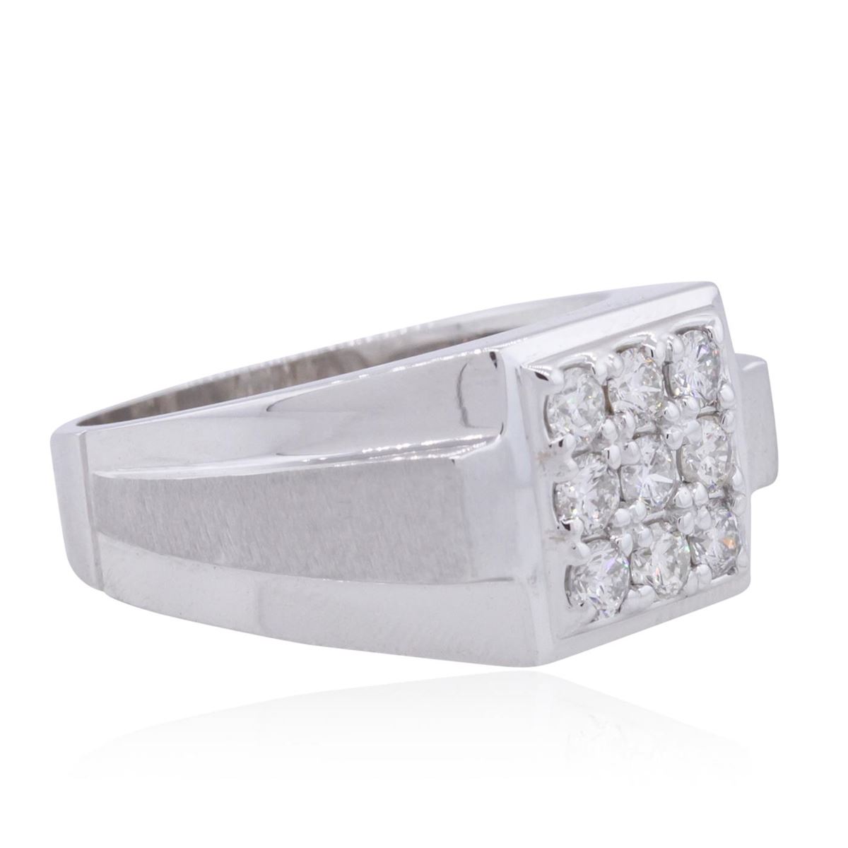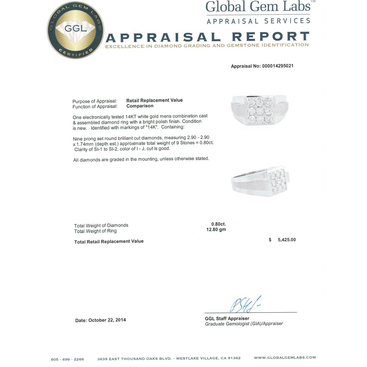 One electronically tested 14KT white gold men's combination cast & assembled diamond ring with a bright polish finish. Identified with markings of "14K". Condition is new. Containing: Nine prong set round brilliant cut diamonds, measuring 2.90 - 2.90 x 1.74mm (depth est.) approximate total weight of 9 Stones = 0.80ct. Clarity: SI-1 to SI-2. Color: I - J, Cut is Good. All diamonds are graded in the mounting, unless otherwise stated. Total Weight of Diamonds 0.80ct. Total Weight of Ring 12.80 grams. GGL Appraised at $5,425.00.