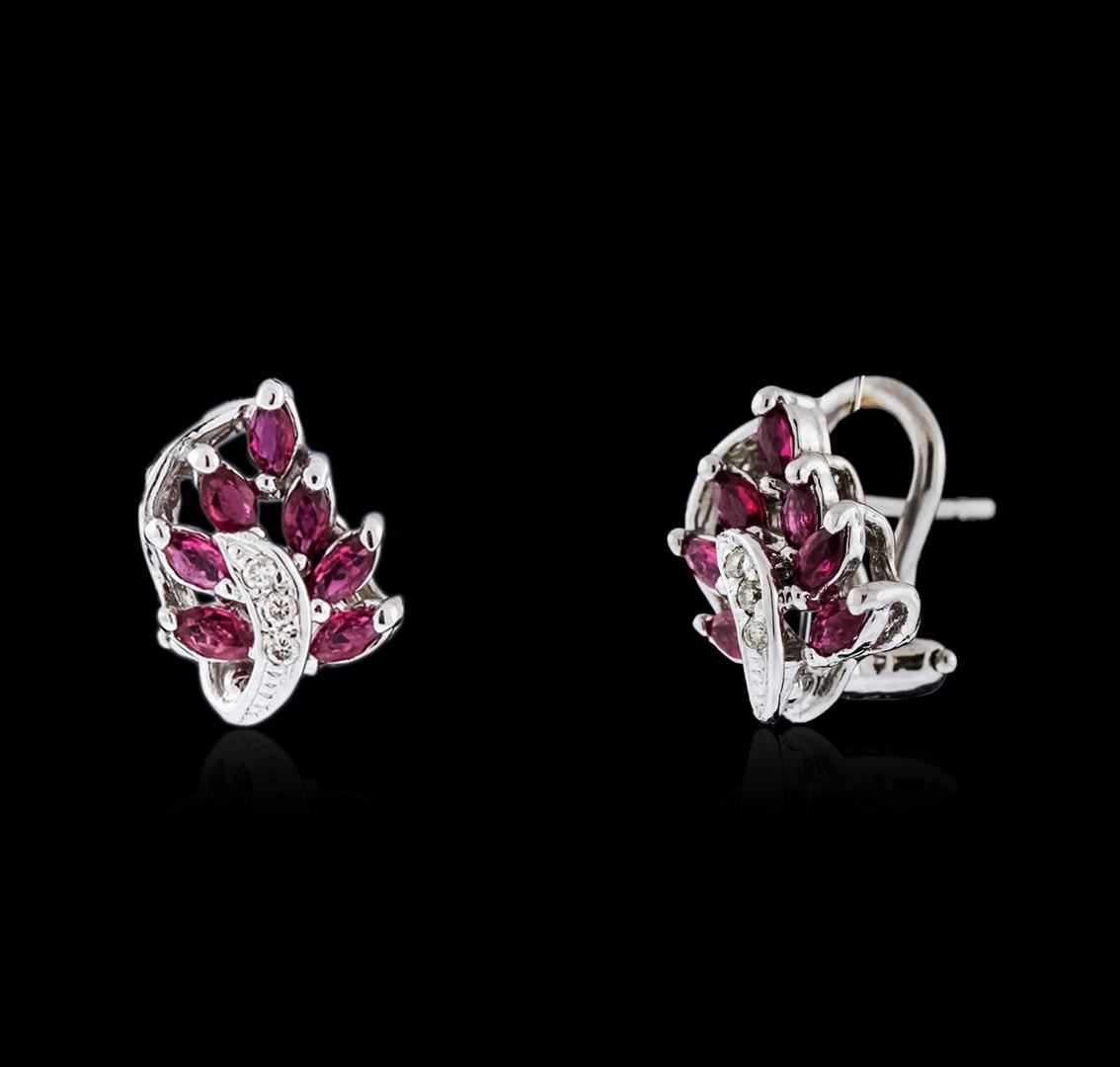 One pair of earrings featuring: 14KT white gold weighing 4.80 grams containing rubies with a total weight of 0.80ct and pave set round diamonds with a total weight of 0.06ct.