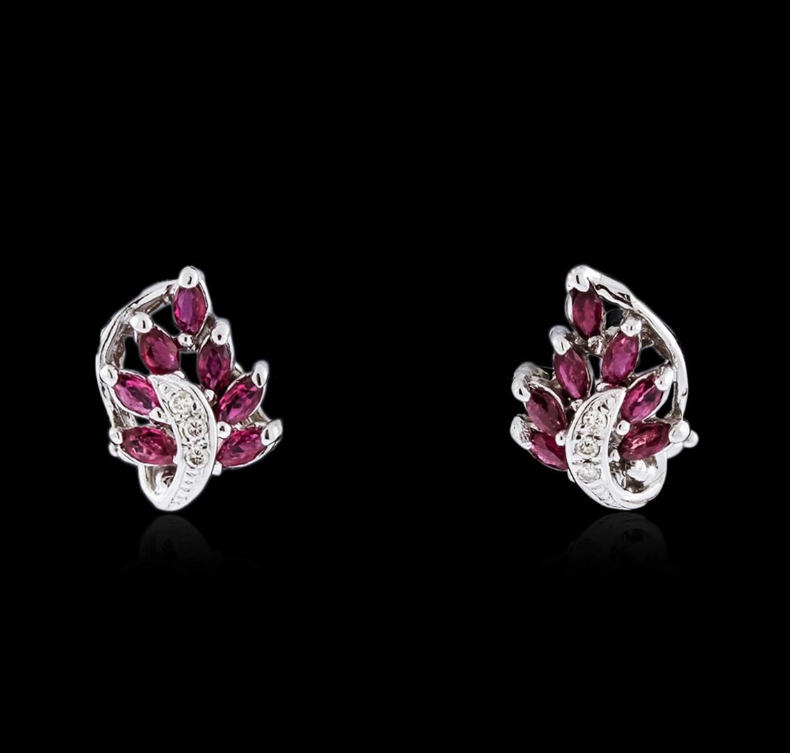 One pair of earrings featuring: 14KT white gold weighing 4.80 grams containing rubies with a total weight of 0.80ct and pave set round diamonds with a total weight of 0.06ct.