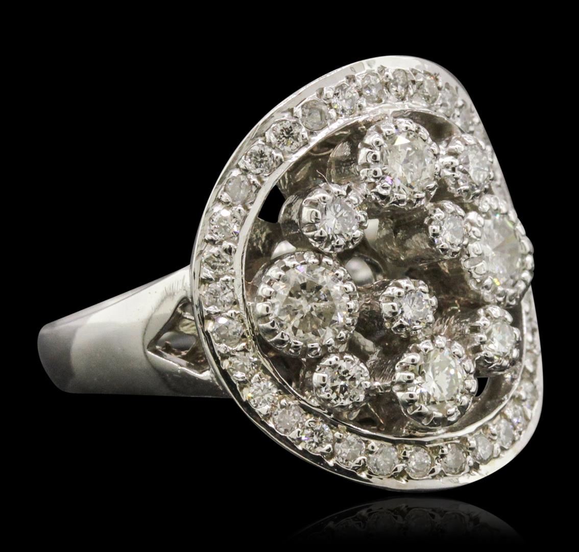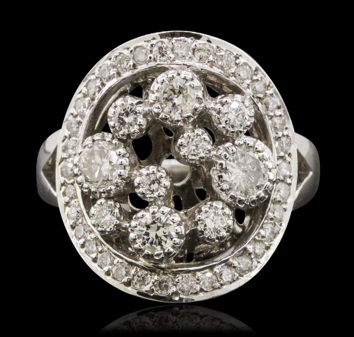One electronically tested 14KT white gold ladies combination cast & assembled ring with a bright polish finish. Condition is new. Identified with markings of "14K". Containing: Thirty-Four prong set round brilliant cut diamonds, measuring 1.20 - 1.20 x 0.72mm (depth est.) approximate. Total Weight of 34 Stones = 0.21ct. Clarity: I-1 to I-2. Color: I - J, Cut is Good. Six gypsy set round brilliant cut diamonds, measuring 1.60 - 1.60 x 0.96mm (depth est.) approximate. Total Weight of 6 Stones = 0.09ct. Clarity: SI-1 to SI-2. Color: I - J, Cut is Good. Four gypsy set round brilliant cut diamonds, measuring 3.50 - 3.00 x 1.95mm (depth est.) approximate. Total Weight of 4 Stones = 0.50ct. Clarity: I-1 to I-2. Color: I - J, Cut is Good. All diamonds are graded in the mounting, unless otherwise stated. Total Weight of Diamonds 0.81ct. Total Weight of Ring 7.30 grams. GGL Appraised at $4,200.00.