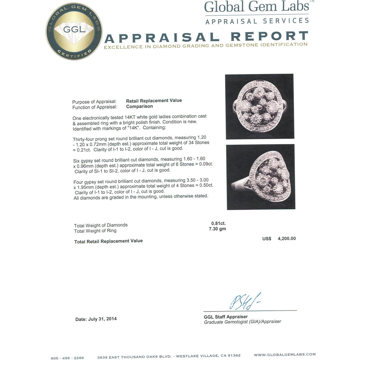 One electronically tested 14KT white gold ladies combination cast & assembled ring with a bright polish finish. Condition is new. Identified with markings of "14K". Containing: Thirty-Four prong set round brilliant cut diamonds, measuring 1.20 - 1.20 x 0.72mm (depth est.) approximate. Total Weight of 34 Stones = 0.21ct. Clarity: I-1 to I-2. Color: I - J, Cut is Good. Six gypsy set round brilliant cut diamonds, measuring 1.60 - 1.60 x 0.96mm (depth est.) approximate. Total Weight of 6 Stones = 0.09ct. Clarity: SI-1 to SI-2. Color: I - J, Cut is Good. Four gypsy set round brilliant cut diamonds, measuring 3.50 - 3.00 x 1.95mm (depth est.) approximate. Total Weight of 4 Stones = 0.50ct. Clarity: I-1 to I-2. Color: I - J, Cut is Good. All diamonds are graded in the mounting, unless otherwise stated. Total Weight of Diamonds 0.81ct. Total Weight of Ring 7.30 grams. GGL Appraised at $4,200.00.