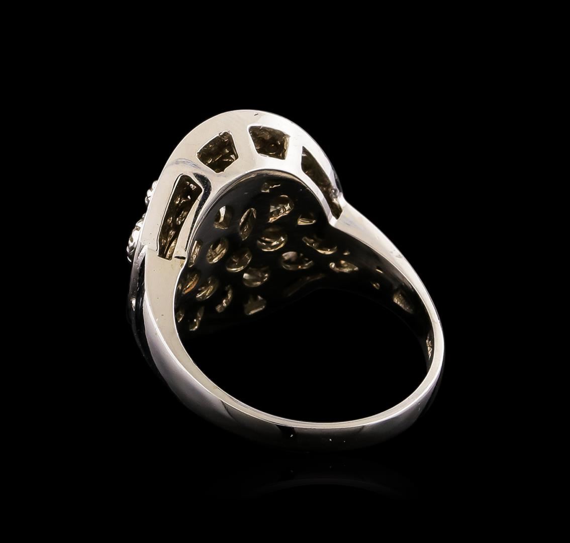 One electronically tested 14KT white gold ladies combination cast & assembled ring with a bright polish finish. Condition is new. Identified with markings of "14K". Containing: Thirty-Four prong set round brilliant cut diamonds, measuring 1.20 - 1.20 x 0.72mm (depth est.) approximate. Total Weight of 34 Stones = 0.21ct. Clarity: I-1 to I-2. Color: I - J, Cut is Good. Six gypsy set round brilliant cut diamonds, measuring 1.60 - 1.60 x 0.96mm (depth est.) approximate. Total Weight of 6 Stones = 0.09ct. Clarity: SI-1 to SI-2. Color: I - J, Cut is Good. Four gypsy set round brilliant cut diamonds, measuring 3.50 - 3.00 x 1.95mm (depth est.) approximate. Total Weight of 4 Stones = 0.50ct. Clarity: I-1 to I-2. Color: I - J, Cut is Good. All diamonds are graded in the mounting, unless otherwise stated. Total Weight of Diamonds 0.81ct. Total Weight of Ring 7.30 grams. GGL Appraised at $4,200.00.