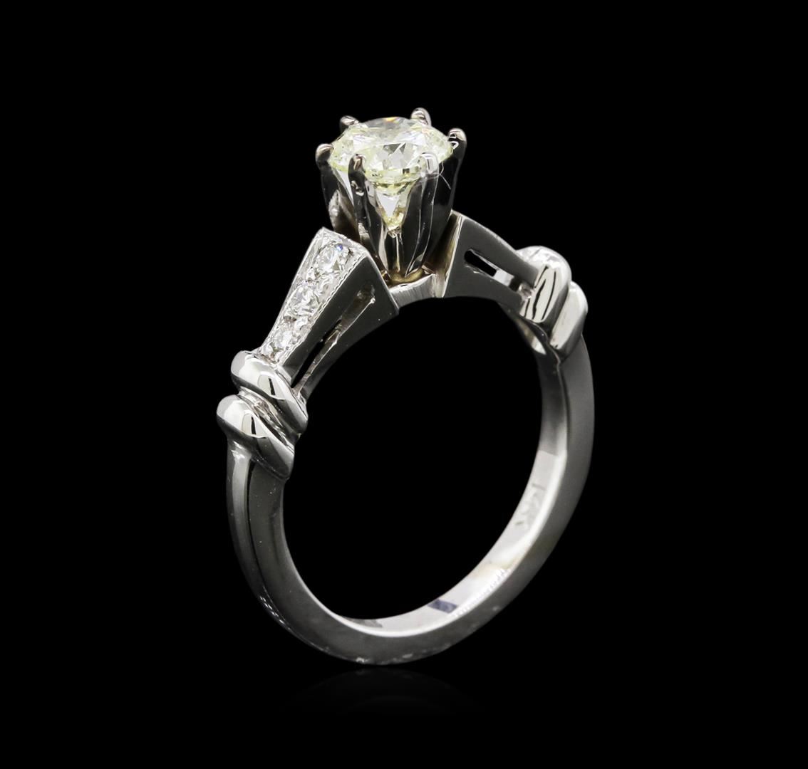 One electronically tested 14KT white gold ladies cast diamond engagement ring with a bright polish finish. Identified with markings of "14K". Condition is new. Containing: One prong set round brilliant cut diamond, measuring 5.80 - 5.80 x 3.48mm (depth est.) approximate weight of 0.71ct. Clarity: I-2. Color: L, Cut is Good. Six prong set round brilliant cut diamonds, measuring 1.80 - 1.50 x 0.99mm (depth est.) approximate total weight of 6 Stones = 0.10ct. Clarity: SI-1. Color: I, Cut is Good. All diamonds are graded in the mounting, unless otherwise stated. Total Weight of Diamonds 0.81ct. Total Weight of Engagement Ring 4.20 grams. GGL Appraised at $3,770.00.