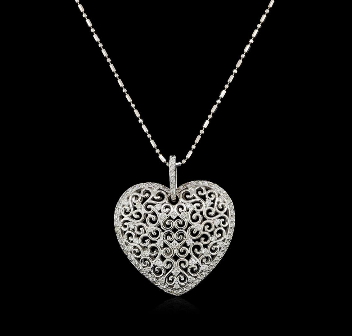 One electronically tested 14KT white gold ladies cast diamond pendant & chain 18.0" long, with a spring ring clasp with a bright polish finish. Condition is new. Containing: One Hundred prong set round brilliant cut diamonds, measuring 1.10 - 1.10 x 0.66mm (depth est.) approximate total weight of 100 Stones = 0.82ct. Clarity: VS-2 to SI-1. Color: I - J, Cut is Good. All diamonds are graded in the mounting, unless otherwise stated. Total Weight of Diamonds 0.82ct. Total Weight of Pendant & Chain 9.70 grams. GGL Appraised at $3,715.00.
