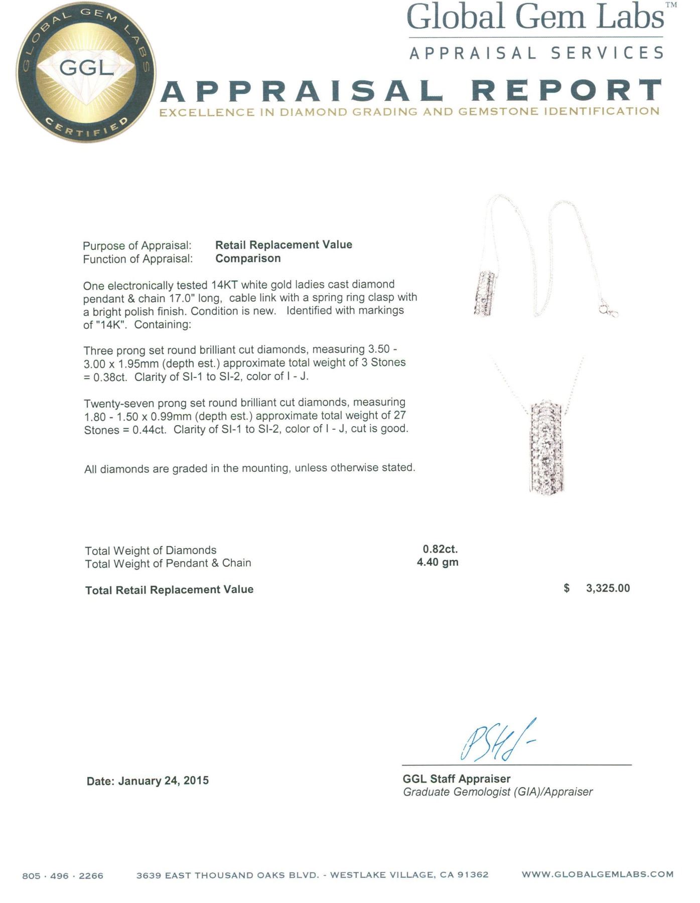 One electronically tested 14KT white gold ladies cast diamond pendant & chain 17.0" long, cable link with a spring ring clasp with a bright polish finish. Identified with markings of "14K". Condition is new. Containing: Three prong set round brilliant cut diamonds, measuring 3.50 - 3.00. x 1.95mm (depth est.) approximate total weight of 3 Stones = 0.38ct. Clarity: SI-1 to SI-2. Color: I - J. Twenty-Seven prong set round brilliant cut diamonds, measuring 1.80 - 1.50 x 0.99mm (depth est.) approximate total weight of 27 Stones = 0.44ct. Clarity: SI-1 to SI-2. Color: I - J, Cut is Good. All diamonds are graded in the mounting, unless otherwise stated. Total Weight of Diamonds 0.82ct. Total Weight of Pendant & Chain 4.40 grams. GGL Appraised at $3,325.00.