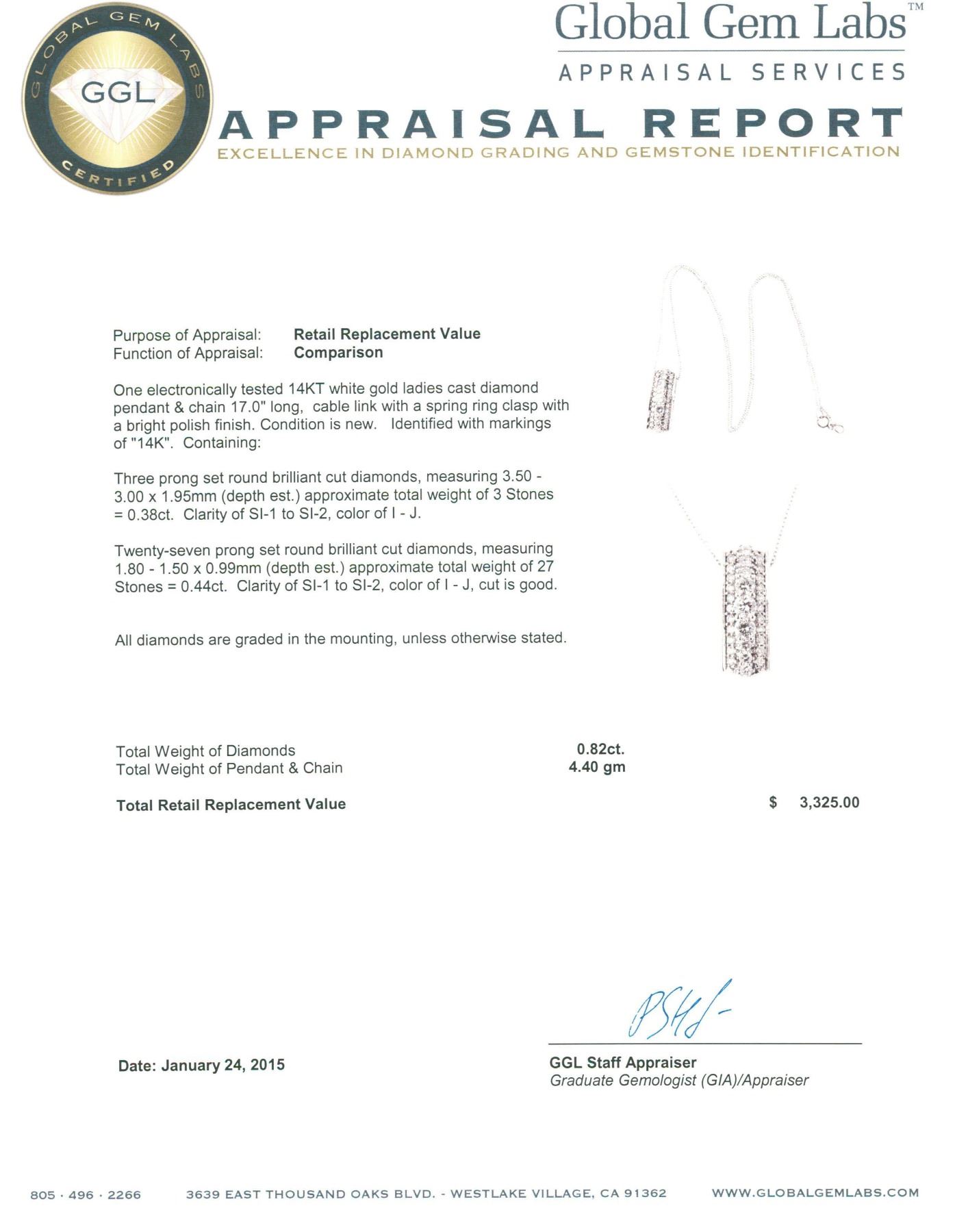 One electronically tested 14KT white gold ladies cast diamond pendant & chain 17.0" long, cable link with a spring ring clasp with a bright polish finish. Identified with markings of "14K". Condition is new. Containing: Three prong set round brilliant cut diamonds, measuring 3.50 - 3.00. x 1.95mm (depth est.) approximate total weight of 3 Stones = 0.38ct. Clarity: SI-1 to SI-2. Color: I - J. Twenty-Seven prong set round brilliant cut diamonds, measuring 1.80 - 1.50 x 0.99mm (depth est.) approximate total weight of 27 Stones = 0.44ct. Clarity: SI-1 to SI-2. Color: I - J, Cut is Good. All diamonds are graded in the mounting, unless otherwise stated. Total Weight of Diamonds 0.82ct. Total Weight of Pendant & Chain 4.40 grams. GGL Appraised.