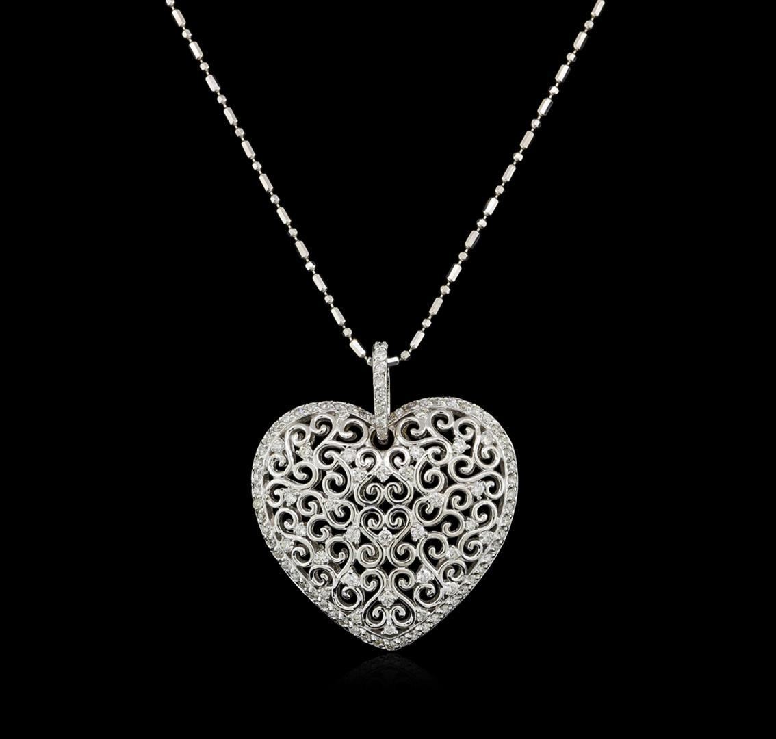 One electronically tested 14KT white gold ladies cast diamond pendant & chain 18.0" long, with a spring ring clasp with a bright polish finish. Condition is new. Containing: One Hundred prong set round brilliant cut diamonds, measuring 1.10 - 1.10 x 0.66mm (depth est.) approximate total weight of 100 Stones = 0.82ct. Clarity: VS-2 to SI-1. Color: I - J, Cut is Good. All diamonds are graded in the mounting, unless otherwise stated. Total Weight of Diamonds 0.82ct. Total Weight of Pendant & Chain 9.70 grams. GGL Appraised.