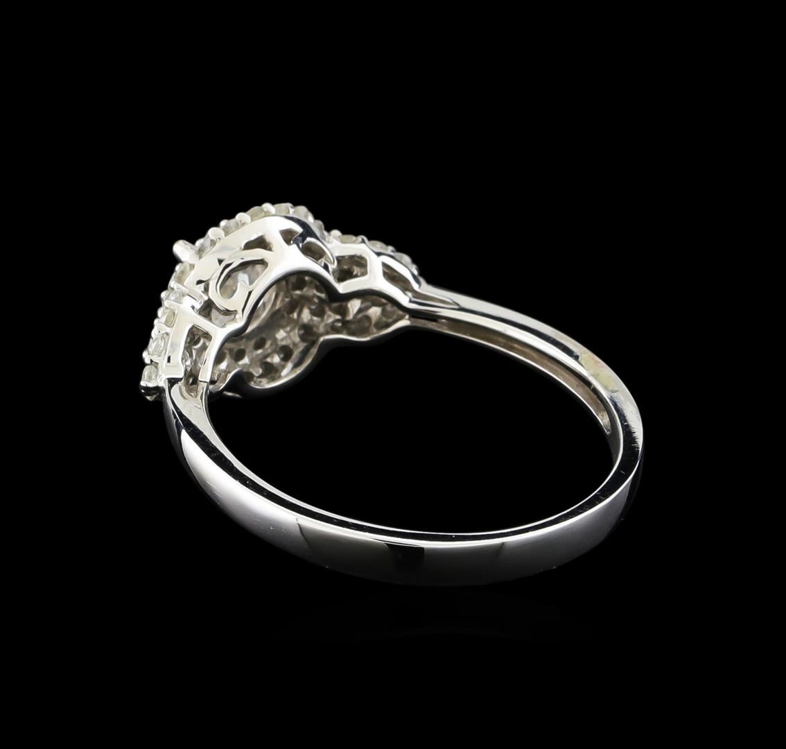 One electronically tested 14KT white gold ladies combination cast & assembled engagement ring with a flat shank with a bright polish finish. Identified with markings of "14K". Condition is new. Containing: One prong set round brilliant cut diamond, measuring 5.40 - 5.30 x 3.26mm (depth est.) approximate weight of 0.57ct. Clarity: I-2. Color: I, Cut is Good. Forty-Eight prong set round brilliant cut diamonds, measuring 1.30 - 1.10 x 0.72mm (depth est.) approximate total weight of 48 Stones = 0.25ct. Clarity: I-1 to I-2. Color: I - J, Cut is Good. All diamonds are graded in the mounting, unless otherwise stated. Total Weight of Diamonds 0.82ct. Total Weight of Ring 2.60 grams. GGL Appraised at $4,025.00.