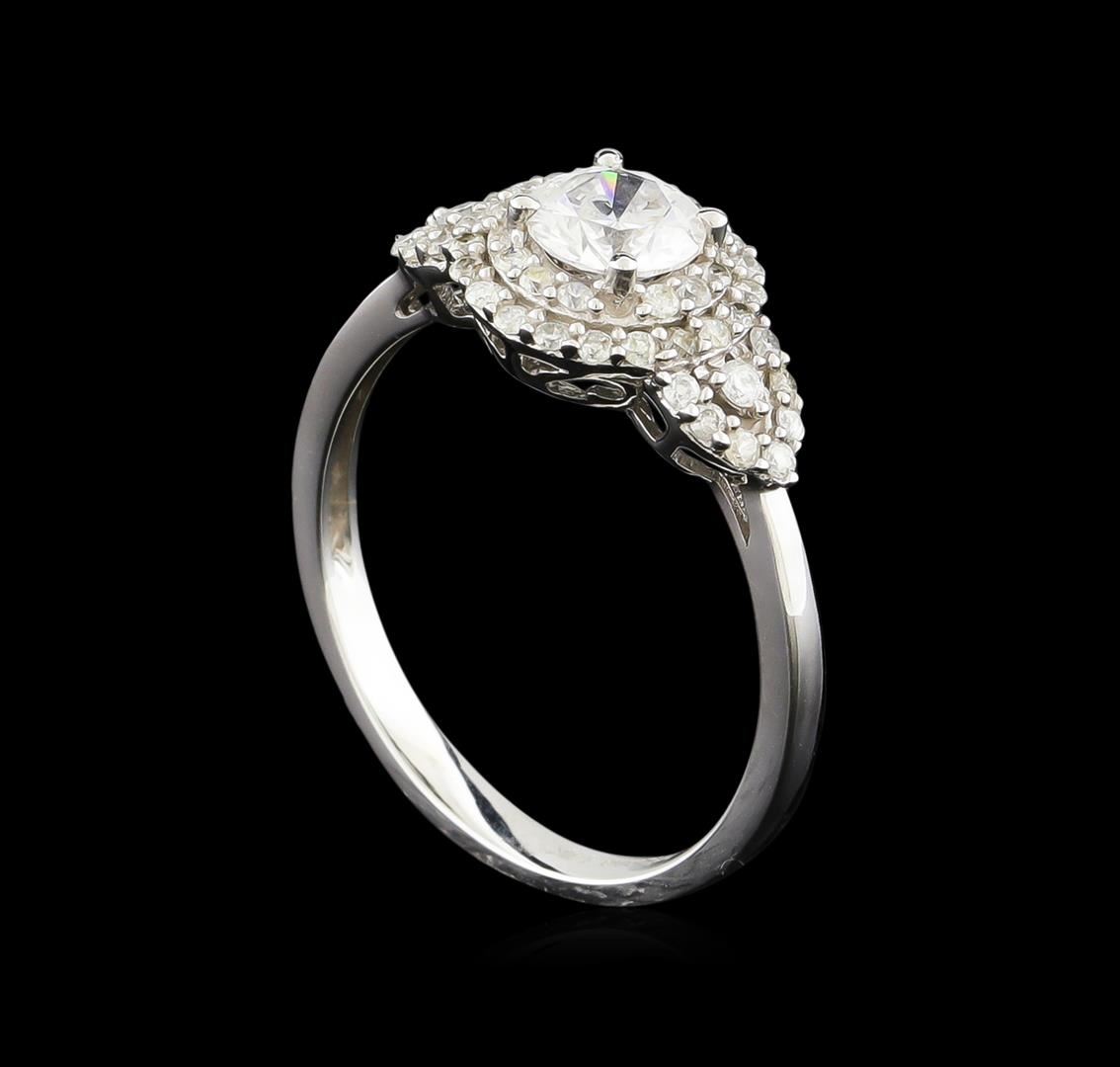 One electronically tested 14KT white gold ladies combination cast & assembled engagement ring with a flat shank with a bright polish finish. Identified with markings of "14K". Condition is new. Containing: One prong set round brilliant cut diamond, measuring 5.40 - 5.30 x 3.26mm (depth est.) approximate weight of 0.57ct. Clarity: I-2. Color: I, Cut is Good. Forty-Eight prong set round brilliant cut diamonds, measuring 1.30 - 1.10 x 0.72mm (depth est.) approximate total weight of 48 Stones = 0.25ct. Clarity: I-1 to I-2. Color: I - J, Cut is Good. All diamonds are graded in the mounting, unless otherwise stated. Total Weight of Diamonds 0.82ct. Total Weight of Ring 2.60 grams. GGL Appraised at $4,025.00.