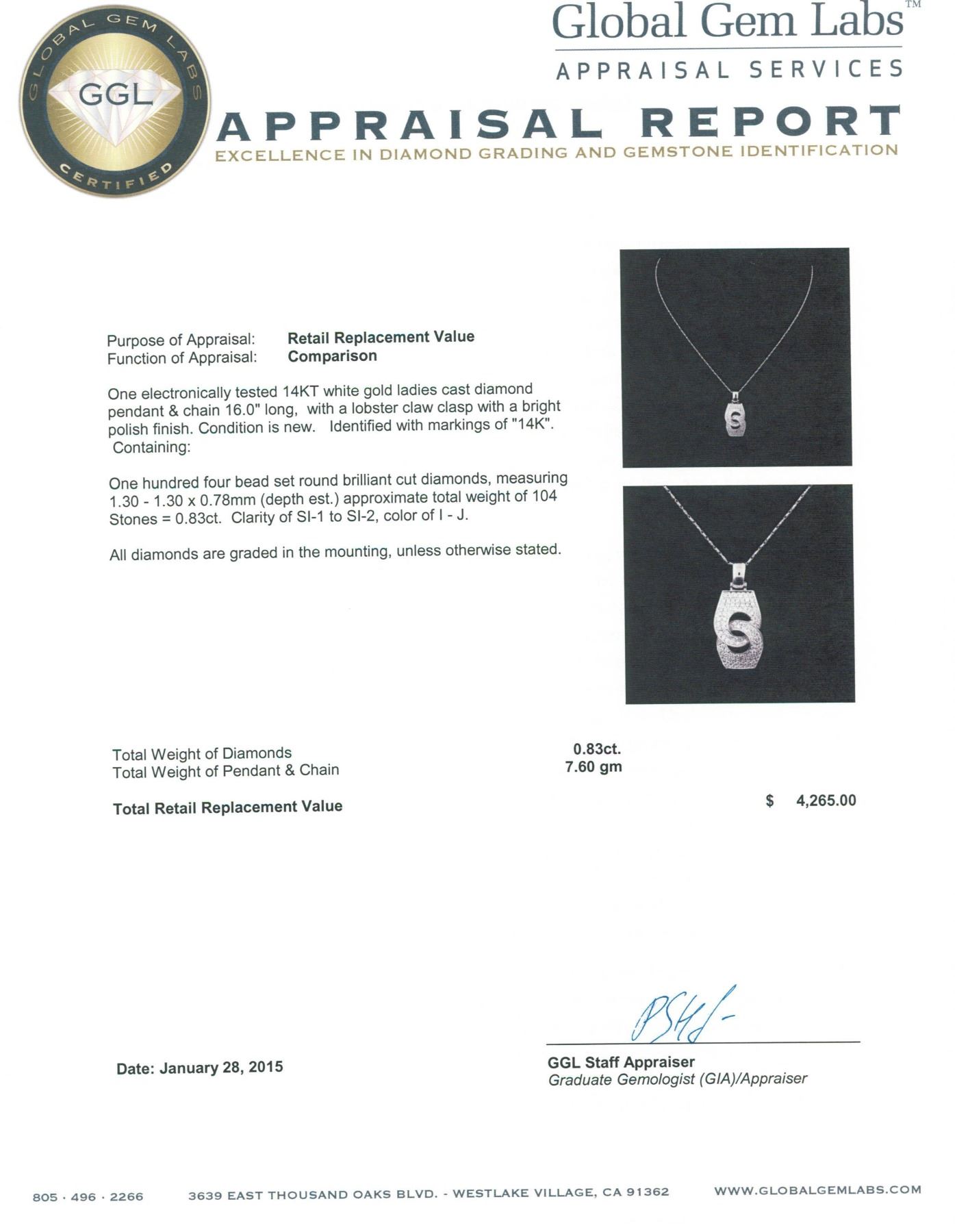 One electronically tested 14KT white gold ladies cast diamond pendant & chain 16.0" long, with a lobster claw clasp with a bright polish finish. Identified with markings of "14K". Condition is new. Containing: One Hundred Four bead set round brilliant cut diamonds, measuring 1.30 - 1.30 x 0.78mm (depth est.) approximate total weight of 104 Stones = 0.83ct. Clarity: SI-1 to SI-2. Color: I - J. All diamonds are graded in the mounting, unless otherwise stated. Total Weight of Diamonds 0.83ct. Total Weight of Pendant & Chain 7.60 grams. GGL Appraised.