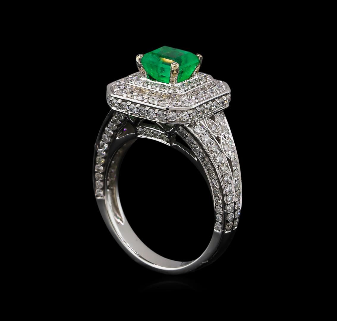 One electronically tested 14KT white gold Ladies combination cast & assembled ring with a bright polish finish. Condition is new. Identified with markings of "14K". Containing: One prong set emerald standard step cut natural emerald, measuring 6.26 x 5.28 x 3.43mm, approximate weight of 0.83ct., clarity is moderately included, type III, medium, moderately strong, green color, (GIA G 5/4), cut is good. Colored gemstones are presumed to have been subjected to commonly used color/clarity enhancement processes. One Hundred Forty prong set round brilliant cut diamonds, measuring 1.40 - 1.10 x 0.75mm (depth est.) approximate. Total Weight of 140 Stones = 0.99ct. . Clarity: I-1 to I-2. Color: H - I, Cut is Good. Total Weight of Colored Stones 0.83ct. Total Weight of Diamonds 0.99ct. Total Weight of Ring 7.00 grams. GGL Appraised at $6,285.00.