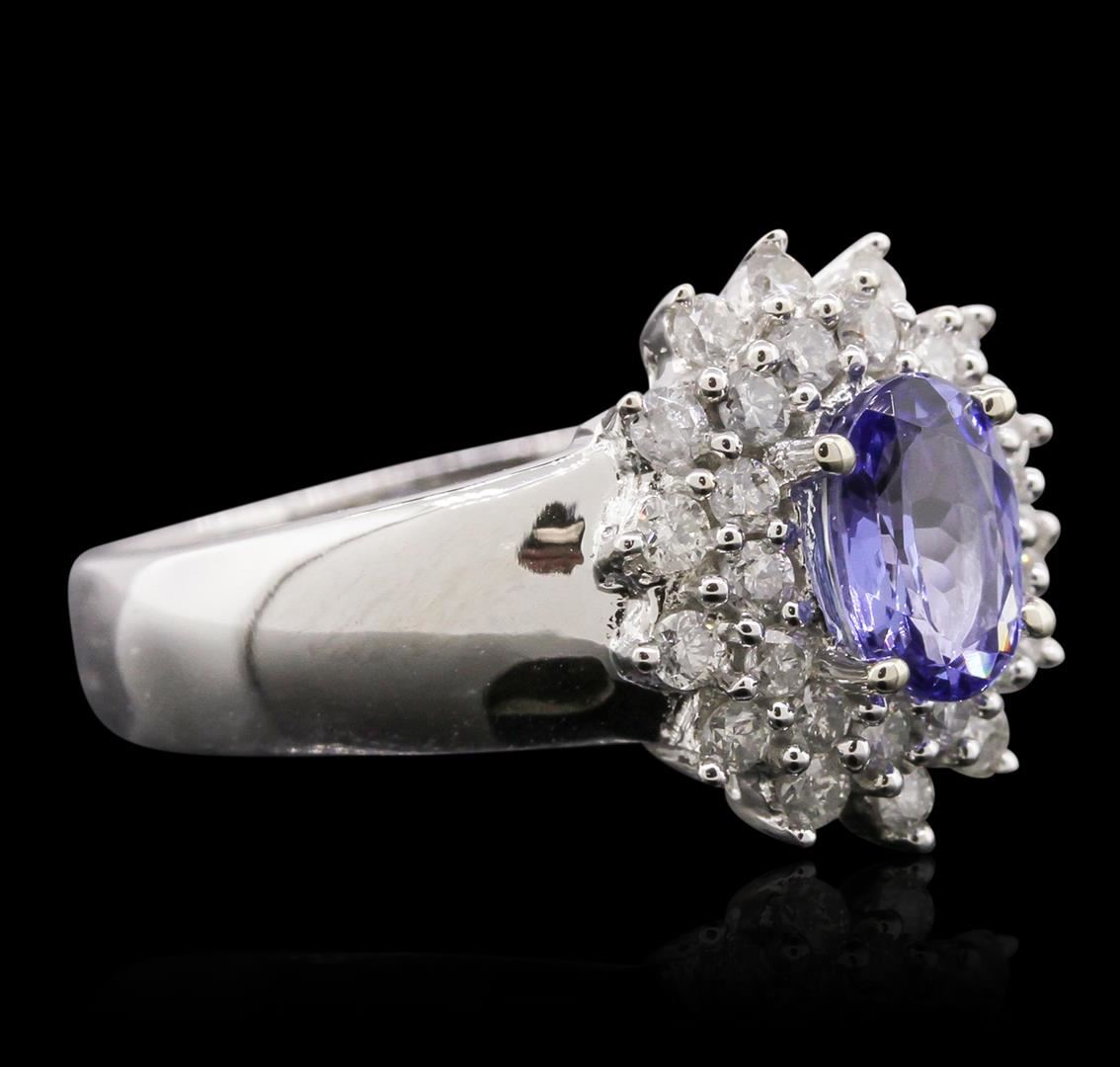 One electronically tested 14KT white gold Ladies combination cast & assembled ring with a bright polish finish. Condition is new. Identified with markings of "14K". Containing: One prong set oval modified brilliant cut natural tanzanite, measuring 7.00 x 5.00 x 3.25mm, approximate weight of 0.83ct., clarity is eye clean, type I, medium, very slightly grayish, violet color, (GIA V 5/3), cut is very good. Colored gemstones are presumed to have been subjected to commonly used color/clarity enhancement processes. Twenty-Eight prong set round brilliant cut diamonds, measuring 2.00 - 2.00 x 1.20mm (depth est.) approximate. Total Weight of 28 Stones = 0.57ct. Clarity: I-1 to I-2. Color: I - J, Cut is Good. Total Weight of Colored Stones 0.83ct. Total Weight of Diamonds 0.57ct. Total Weight of Ring 6.40 grams. GGL Appraised at $4,715.00.
