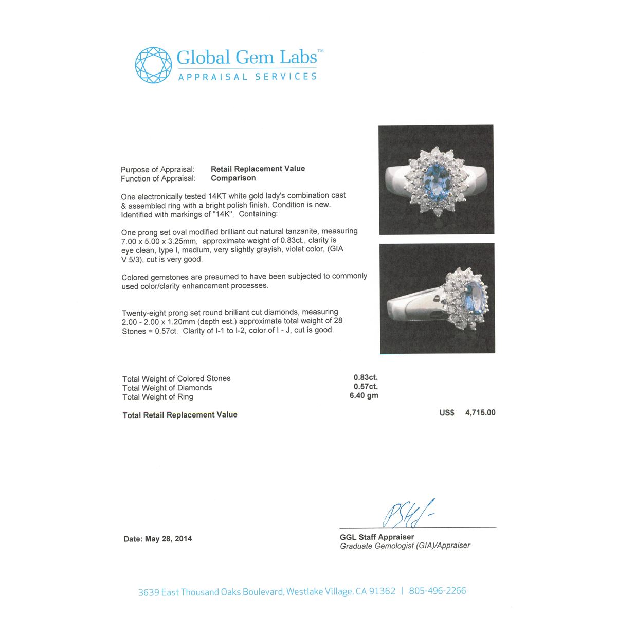 One electronically tested 14KT white gold Ladies combination cast & assembled ring with a bright polish finish. Condition is new. Identified with markings of "14K". Containing: One prong set oval modified brilliant cut natural tanzanite, measuring 7.00 x 5.00 x 3.25mm, approximate weight of 0.83ct., clarity is eye clean, type I, medium, very slightly grayish, violet color, (GIA V 5/3), cut is very good. Colored gemstones are presumed to have been subjected to commonly used color/clarity enhancement processes. Twenty-Eight prong set round brilliant cut diamonds, measuring 2.00 - 2.00 x 1.20mm (depth est.) approximate. Total Weight of 28 Stones = 0.57ct. Clarity: I-1 to I-2. Color: I - J, Cut is Good. Total Weight of Colored Stones 0.83ct. Total Weight of Diamonds 0.57ct. Total Weight of Ring 6.40 grams. GGL Appraised at $4,715.00.