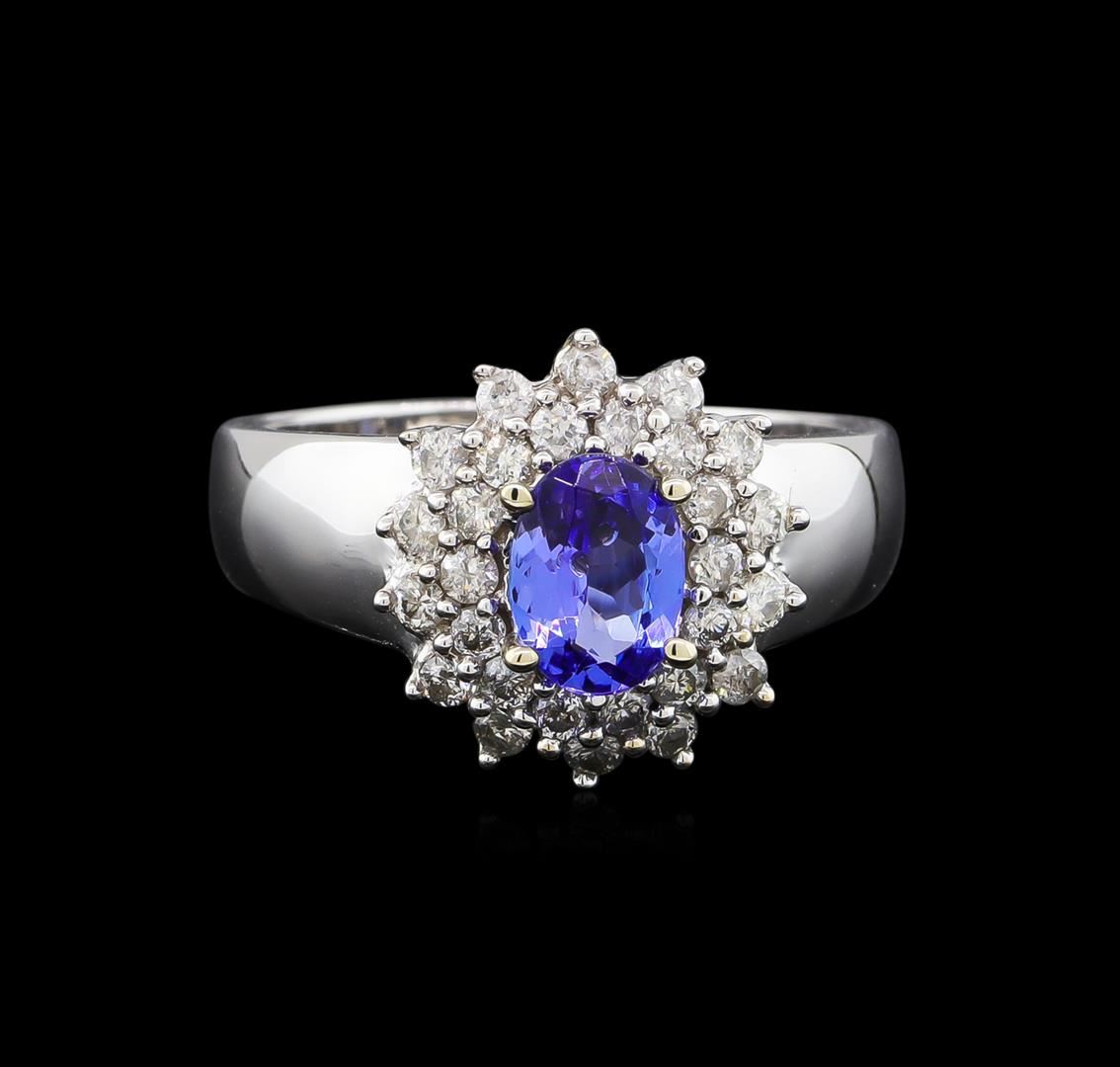 One electronically tested 14KT white gold Ladies combination cast & assembled ring with a bright polish finish. Condition is new. Identified with markings of "14K". Containing: One prong set oval modified brilliant cut natural tanzanite, measuring 7.00 x 5.00 x 3.25mm, approximate weight of 0.83ct., clarity is eye clean, type I, medium, very slightly grayish, violet color, (GIA V 5/3), cut is very good. Colored gemstones are presumed to have been subjected to commonly used color/clarity enhancement processes. Twenty-Eight prong set round brilliant cut diamonds, measuring 2.00 - 2.00 x 1.20mm (depth est.) approximate. Total Weight of 28 Stones = 0.57ct. Clarity: I-1 to I-2. Color: I - J, Cut is Good. Total Weight of Colored Stones 0.83ct. Total Weight of Diamonds 0.57ct. Total Weight of Ring 6.40 grams. GGL Appraised.