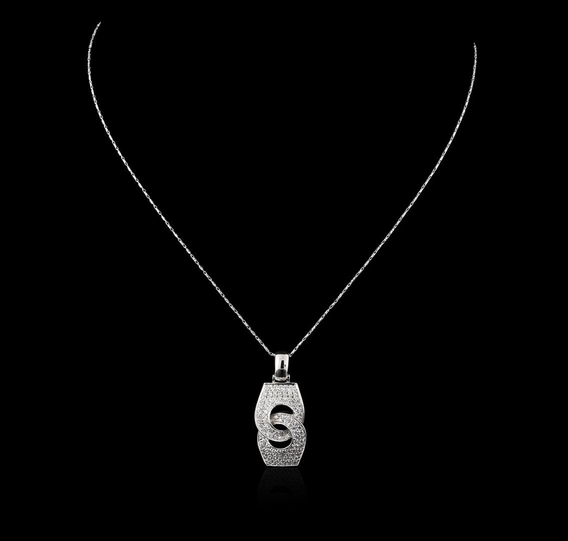 One electronically tested 14KT white gold ladies cast diamond pendant & chain 16.0" long, with a lobster claw clasp with a bright polish finish. Identified with markings of "14K". Condition is new. Containing: One Hundred Four bead set round brilliant cut diamonds, measuring 1.30 - 1.30 x 0.78mm (depth est.) approximate total weight of 104 Stones = 0.83ct. Clarity: SI-1 to SI-2. Color: I - J. All diamonds are graded in the mounting, unless otherwise stated. Total Weight of Diamonds 0.83ct. Total Weight of Pendant & Chain 7.60 grams. GGL Appraised at $4,265.00.