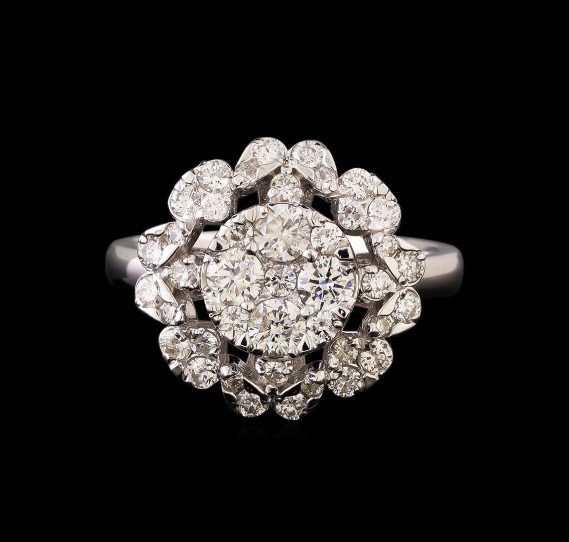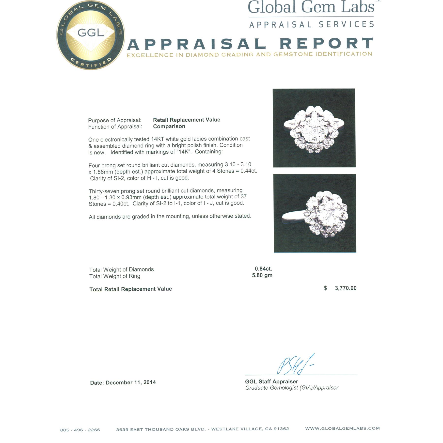 One electronically tested 14KT white gold ladies combination cast & assembled diamond ring with a bright polish finish. Identified with markings of "14K". Condition is new. Containing: Four prong set round brilliant cut diamonds, measuring 3.10 - 3.10 x 1.86mm (depth est.) approximate total weight of 4 Stones = 0.44ct. Clarity: SI-2. Color: H - I, Cut is Good. Thirty-Seven prong set round brilliant cut diamonds, measuring 1.80 - 1.30 x 0.93mm (depth est.) approximate total weight of 37 Stones = 0.40ct. Clarity: SI-2 to I-1. Color: I - J, Cut is Good. All diamonds are graded in the mounting, unless otherwise stated. Total Weight of Diamonds 0.84ct. Total Weight of Ring 5.80 grams. GGL Appraised at $3,770.00.