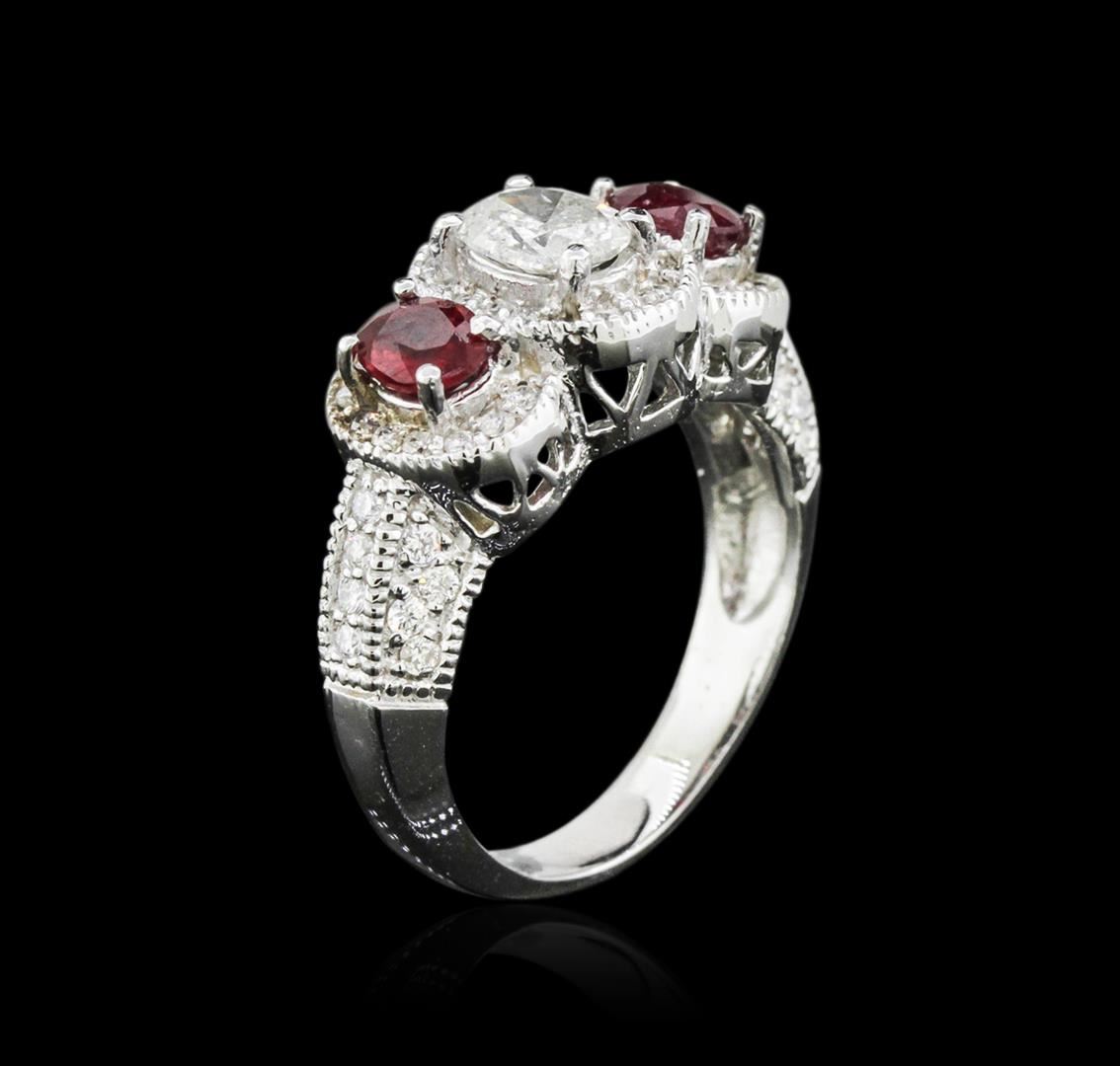 One electronically tested 14KT white gold ladies cast ruby and diamond ring with a bright polish finish. Identified with markings of "14K". Condition is new. Containing: One prong set oval shaped cut diamond, measuring 6.00 x 5.00 x 3.15mm (depth est.) approximate weight of 0.59ct. Clarity: I-2. Color: J, Cut is Good. Fifty-Nine prong set round brilliant cut diamonds, measuring 1.20 - 1.20 x 0.72mm (depth est.) approximate total weight of 59 Stones = 0.37ct. Clarity: SI-2 to I-1. Color: I - J, Cut is Good. Two prong set oval modified brilliant cut natural rubies, measuring 4.80 x 4.00 x 2.60mm, approximate total weight of 0.84ct., clarity is moderately included, medium, very slightly brownish, red color, (GIA R 5/3), cut is good. Colored gemstones are presumed to have been subjected to commonly used enhancement processes. All diamonds and colored gemstones are graded in the mounting, unless otherwise stated. Total Weight of Colored Stones 0.84ct. Total Weight of Diamonds 0.96ct. Total Weight of Ring 6.00 grams. GGL Appraised at $3,830.00.
