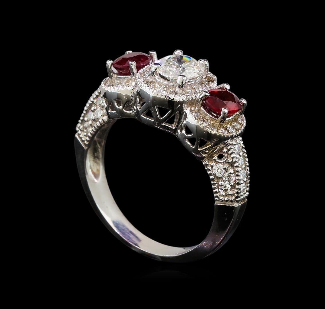 One electronically tested 14KT white gold ladies cast ruby and diamond ring with a bright polish finish. Identified with markings of "14K". Condition is new. Containing: One prong set oval shaped cut diamond, measuring 6.00 x 5.00 x 3.15mm (depth est.) approximate weight of 0.59ct. Clarity: I-2. Color: J, Cut is Good. Fifty-Nine prong set round brilliant cut diamonds, measuring 1.20 - 1.20 x 0.72mm (depth est.) approximate total weight of 59 Stones = 0.37ct. Clarity: SI-2 to I-1. Color: I - J, Cut is Good. Two prong set oval modified brilliant cut natural rubies, measuring 4.80 x 4.00 x 2.60mm, approximate total weight of 0.84ct., clarity is moderately included, medium, very slightly brownish, red color, (GIA R 5/3), cut is good. Colored gemstones are presumed to have been subjected to commonly used enhancement processes. All diamonds and colored gemstones are graded in the mounting, unless otherwise stated. Total Weight of Colored Stones 0.84ct. Total Weight of Diamonds 0.96ct. Total Weight of Ring 6.00 grams. GGL Appraised at $3,830.00.