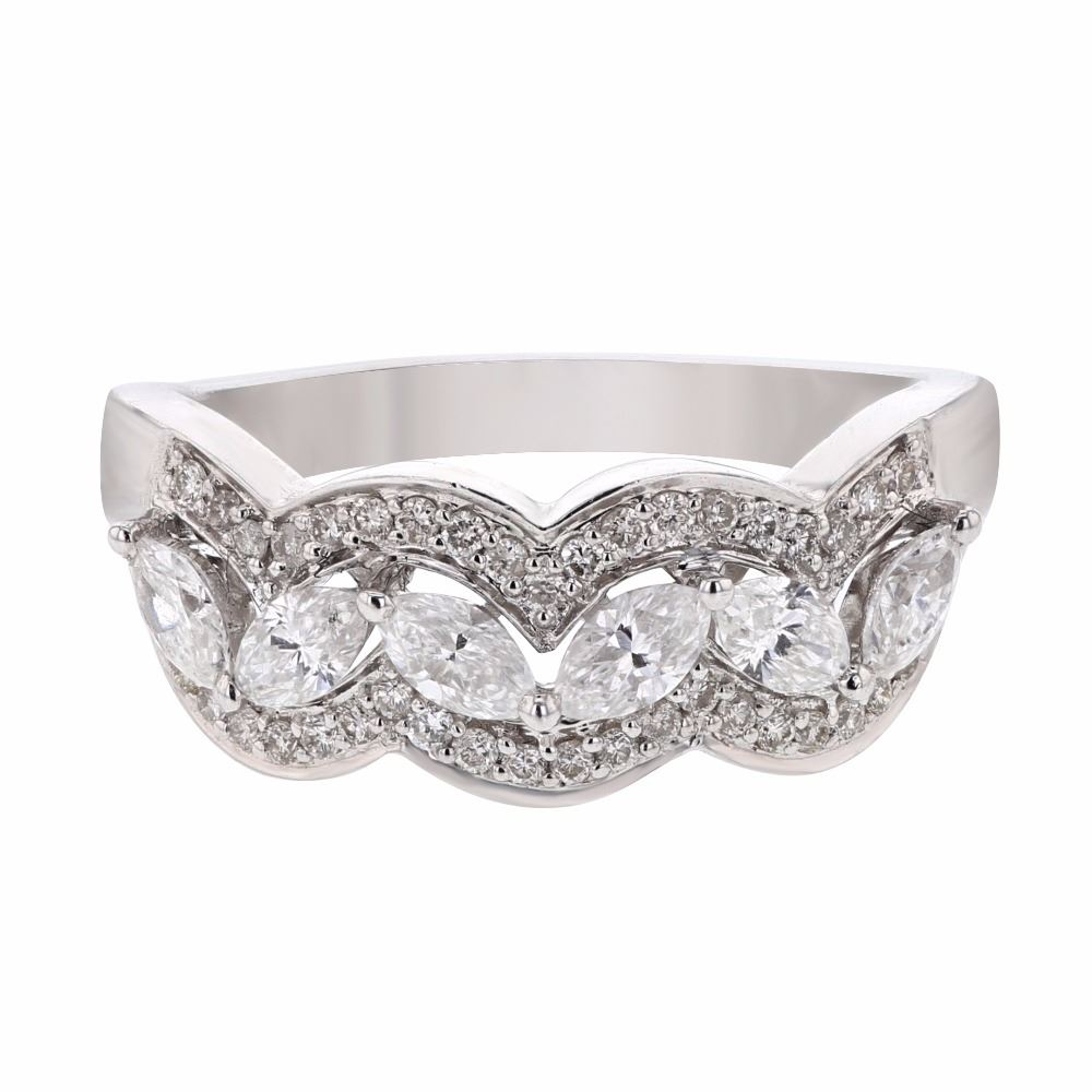 One 14KT White Gold 0.84ctw Diamond Ring. (6) Marquise Diamonds with a total weight of 0.62cts. (43) Round Diamonds with a total weight of 0.22cts. Total weight of this ring is 3.73 grams.