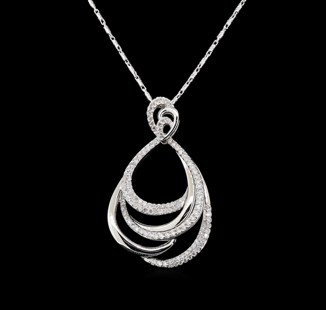 One electronically tested 14KT white gold ladies cast diamond pendant & chain 18.0" long, fancy link with a lobster claw clasp with a bright polish finish. Measurements: 18" in length Identified with markings of "K14". Condition is new. Containing: One Hundred Six prong set round brilliant cut diamonds, measuring 1.30 - 1.30 x 0.78mm (depth est.) approximate total weight of 106 Stones = 0.85ct. Clarity: I-1 to I-2. Color: I - J, Cut is Good. All diamonds are graded in the mounting, unless otherwise stated. Total Weight of Diamonds 0.85ct. Total Weight of Pendant & Chain 11.60 grams. GGL Appraised at $5,625.00.