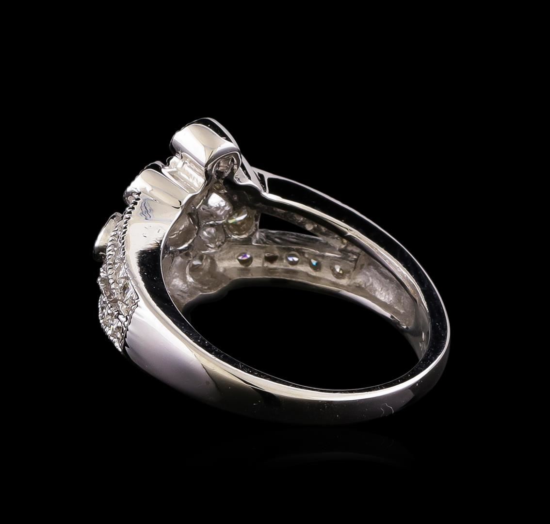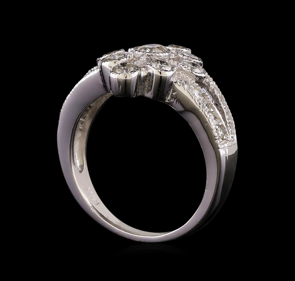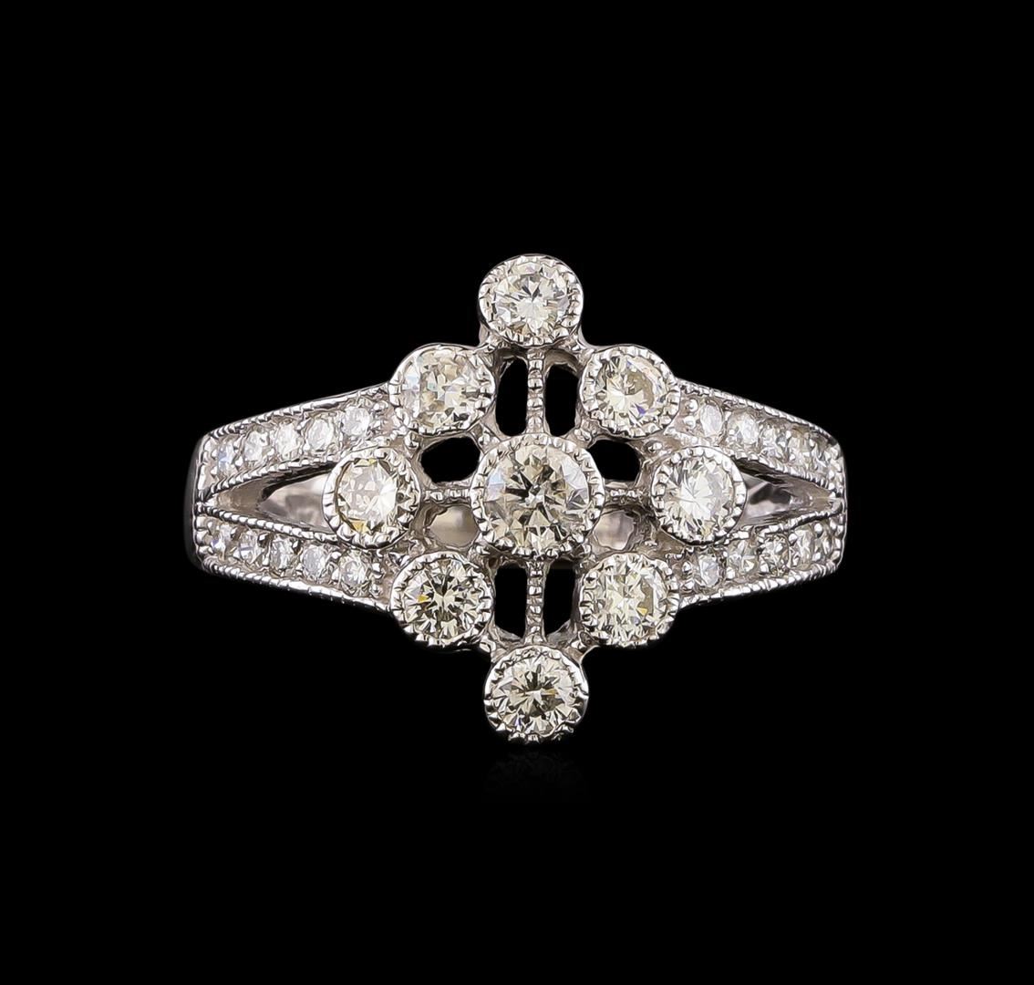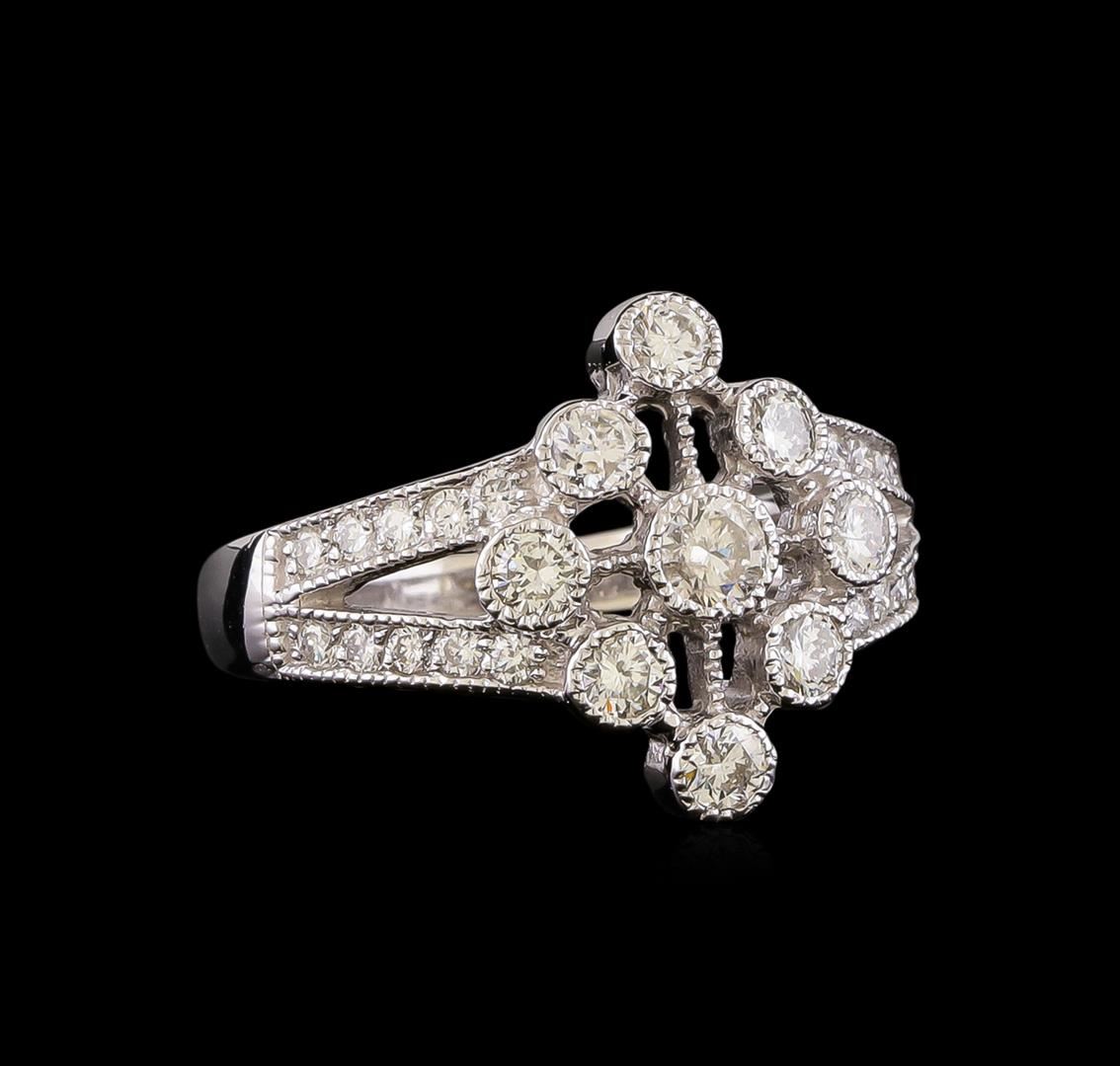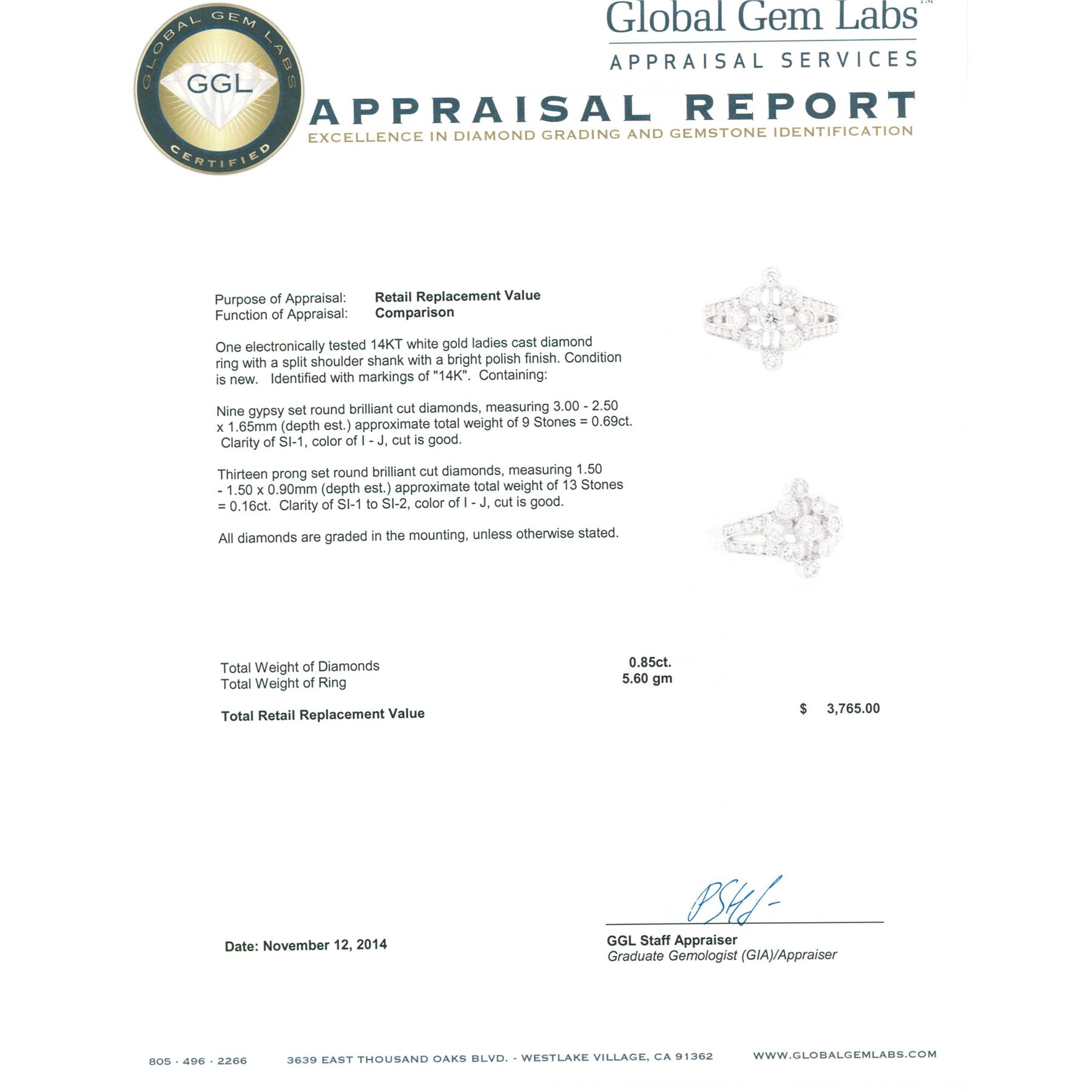 One electronically tested 14KT white gold ladies cast diamond ring with a split shoulder shank with a bright polish finish. Identified with markings of "14K". Condition is new. Containing: Nine gypsy set round brilliant cut diamonds, measuring 3.00 - 2.50 x 1.65mm (depth est.) approximate total weight of 9 Stones = 0.69ct. Clarity: SI-1. Color: I - J, Cut is Good. Thirteen prong set round brilliant cut diamonds, measuring 1.50 - 1.50 x 0.90mm (depth est.) approximate total weight of 13 Stones = 0.16ct. Clarity: SI-1 to SI-2. Color: I - J, Cut is Good. All diamonds are graded in the mounting, unless otherwise stated. Total Weight of Diamonds 0.85ct. Total Weight of Ring 5.60 grams. GGL Appraised.