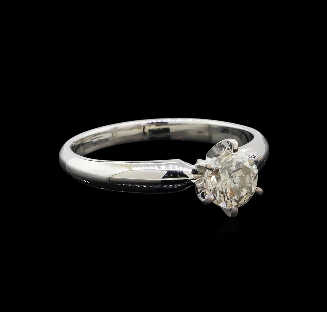 One electronically tested 14KT white gold ladies cast diamond solitaire ring with a half round shank with a bright polish finish. Identified with markings of "14K". Condition is new. Containing: One prong set round brilliant cut diamond, measuring 5.70 - 5.70 x 3.42mm (depth est.) exact weight 0.85ct. Clarity: I-2. Color: K, Cut is Good. Diamonds are graded in the mounting, unless otherwise stated. Total Weight of Diamonds 0.85ct. Total Weight of Solitaire Ring 2.70 grams. GGL Appraised.