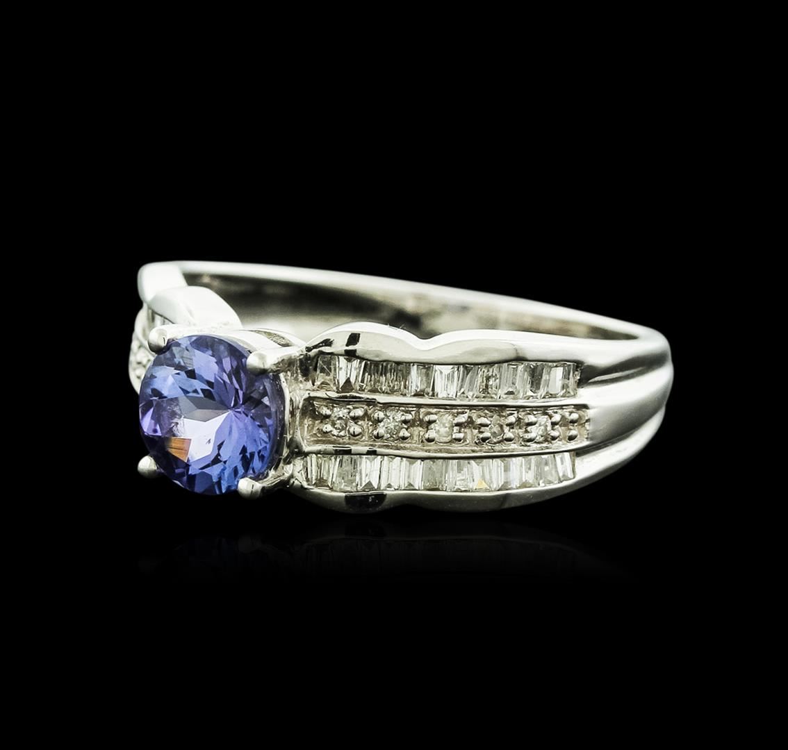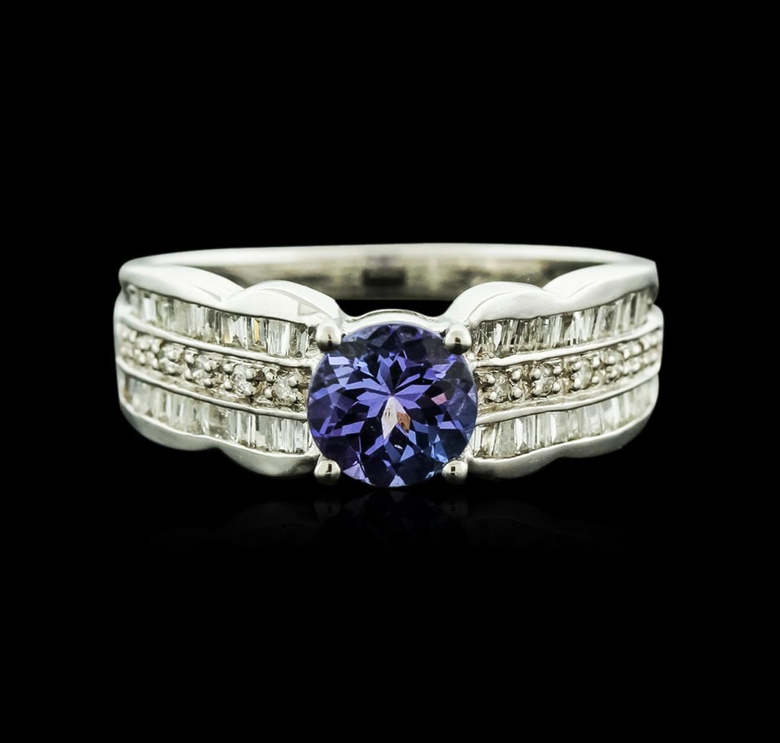 One electronically tested 14KT white gold ladies cast tanzanite and diamond ring with a bright polish finish. Identified with markings of "14K". Condition is new. Containing: One prong set round modified brilliant cut natural tanzanite, measuring 5.80 - 5.80 x 3.77 mm, approximate weight of 0.85ct., clarity is eye clean, type I, medium light, very slightly grayish, violet color, (GIA V 4/3), cut is good. Ten prong set round brilliant cut diamonds, measuring 1.10 - 1.10 x 0.66mm (depth est.) approximate total weight of 10 Stones = 0.05ct. Clarity: SI-2 to I-1. Color: I - J. Forty-Eight channel set baguette cut diamonds, measuring 1.30 x 1.00 x 0.85mm (depth est.) approximate total weight of 48 Stones = 0.49ct. Clarity: I-1 to I-2. Color: I - J. Colored gemstones are presumed to have been subjected to commonly used enhancement processes. All diamonds and colored gemstones are graded in the mounting, unless otherwise stated. Total Weight of Colored Stones 0.85ct. Total Weight of Diamonds 0.53ct. Total Weight of Ring 3.20 grams. GGL Appraised at $1,890.00.