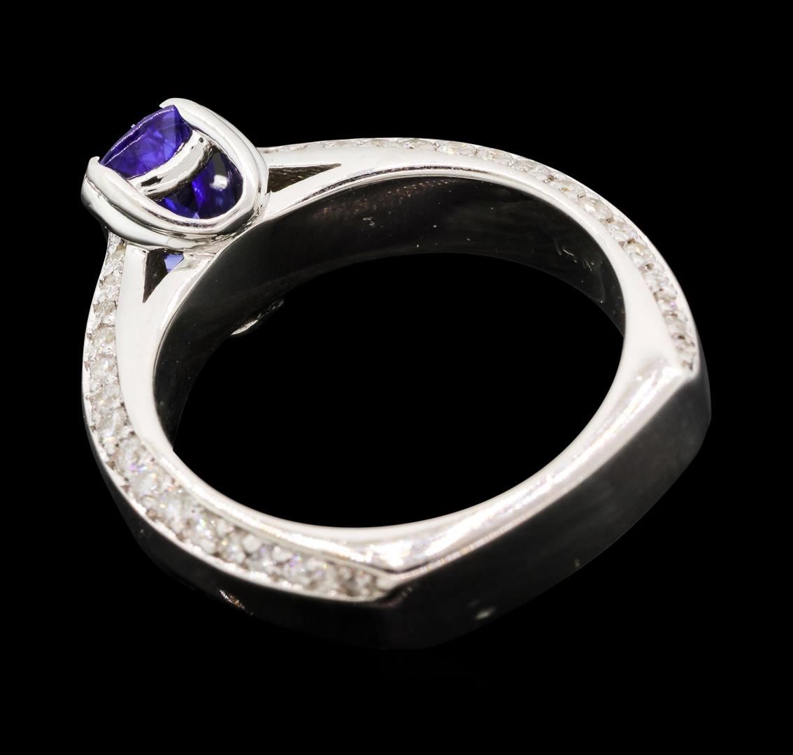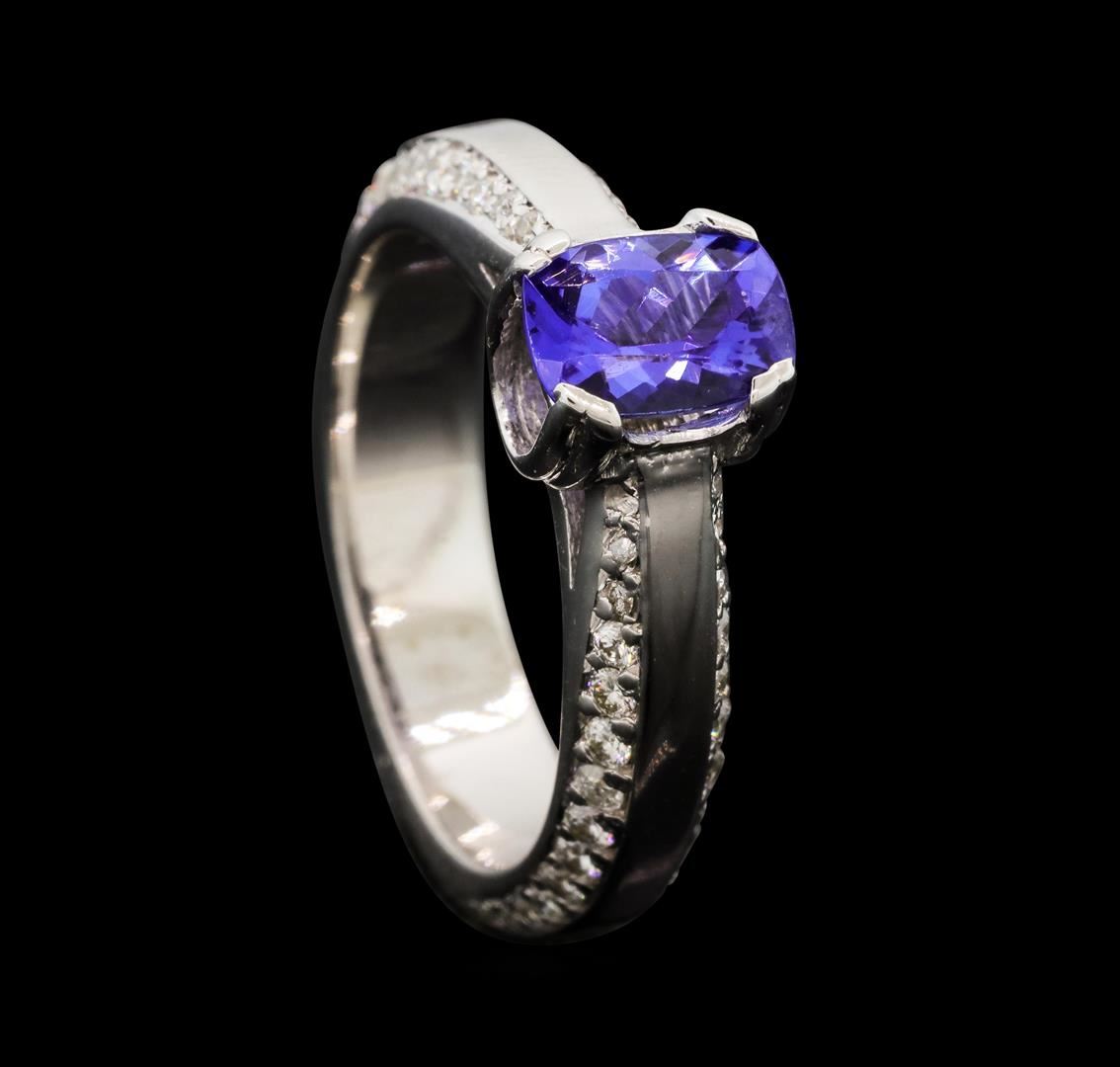 One electronically tested 14KT white gold lady's cast fashion ring with a cathedral European shank with a bright polish finish. The featured lady's ring has a shank measuring 4.30 millimeters wide. Identified with markings of "14K". Condition is new, good workmanship. Containing: One prong set rectangular cushion modified brilliant cut natural tanzanite, measuring 7.00 x 4.98 x 3.10mm, (depth est.) approximate weight of 0.85ct., clarity is eye clean, medium dark, strong, violetish blue color, (GIA vB 6/5), cut is good. Transmitting light with no distortion, transparent. Colored gemstones are presumed to have been subjected to commonly used enhancement processes. Graded in the setting. Sixty-Four prong set round brilliant cut diamonds, measuring 1.40 - 1.00 x 0.74mm (depth est.) approximate. Total Weight of 64 Stones = 0.50ct. Graded in the setting. Color H - I Clarity SI-1 to I-1 Cut Good. Total Weight of Colored Stones 0.85ct.. Total Weight of Diamonds 0.50ct.. Total Weight of Ring 7.10gm. GAS Appraised.
