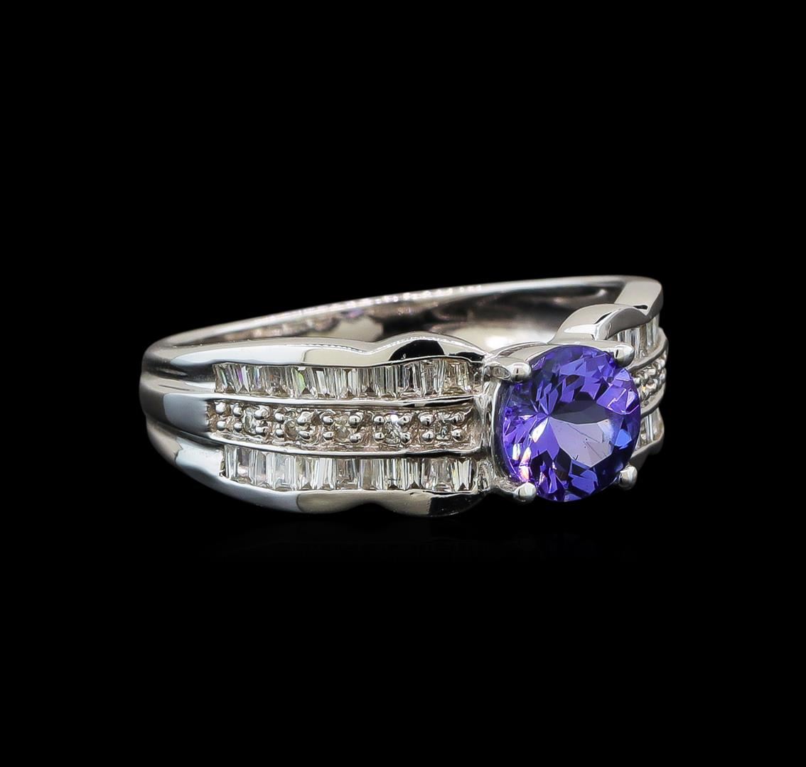 One electronically tested 14KT white gold ladies cast tanzanite and diamond ring with a bright polish finish. Identified with markings of "14K". Condition is new. Containing: One prong set round modified brilliant cut natural tanzanite, measuring 5.80 - 5.80 x 3.77 mm, approximate weight of 0.85ct., clarity is eye clean, type I, medium light, very slightly grayish, violet color, (GIA V 4/3), cut is good. Ten prong set round brilliant cut diamonds, measuring 1.10 - 1.10 x 0.66mm (depth est.) approximate total weight of 10 Stones = 0.05ct. Clarity: SI-2 to I-1. Color: I - J. Forty-Eight channel set baguette cut diamonds, measuring 1.30 x 1.00 x 0.85mm (depth est.) approximate total weight of 48 Stones = 0.49ct. Clarity: I-1 to I-2. Color: I - J. Colored gemstones are presumed to have been subjected to commonly used enhancement processes. All diamonds and colored gemstones are graded in the mounting, unless otherwise stated. Total Weight of Colored Stones 0.85ct. Total Weight of Diamonds 0.53ct. Total Weight of Ring 3.20 grams. GGL Appraised at $1,890.00.