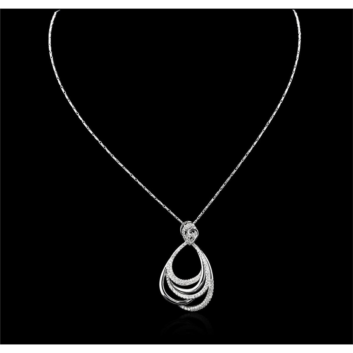 One electronically tested 14KT white gold ladies cast diamond pendant & chain 18.0" long, fancy link with a lobster claw clasp with a bright polish finish. Measurements: 18" in length Identified with markings of "K14". Condition is new. Containing: One Hundred Six prong set round brilliant cut diamonds, measuring 1.30 - 1.30 x 0.78mm (depth est.) approximate total weight of 106 Stones = 0.85ct. Clarity: I-1 to I-2. Color: I - J, Cut is Good. All diamonds are graded in the mounting, unless otherwise stated. Total Weight of Diamonds 0.85ct. Total Weight of Pendant & Chain 11.60 grams. GGL Appraised at $5,625.00.
