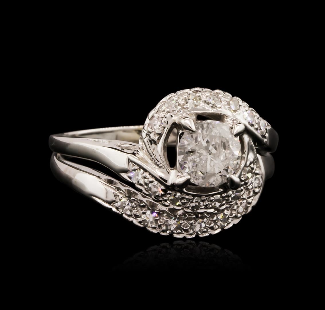 One electronically tested 14KT white gold ladies cast diamond engagement ring with a bright polish finish. Identified with markings of "14K". Condition is new. Containing: One prong set round brilliant cut diamond, measuring 5.40 - 5.40 x 3.24mm (depth est.) approximate weight of 0.58ct. Clarity: I-2. Color: J, Cut is Good. Twenty-Two prong set single cut diamonds, measuring 1.50 - 1.50 x 0.90mm (depth est.) approximate total weight of 22 Stones = 0.27ct. Clarity: SI-1. Color: H - I, Cut is Good. All diamonds are graded in the mounting, unless otherwise stated. Total Weight of Diamonds 0.85ct. Total Weight of Engagement Ring 4.50 grams. GGL Appraised at $3,855.00.