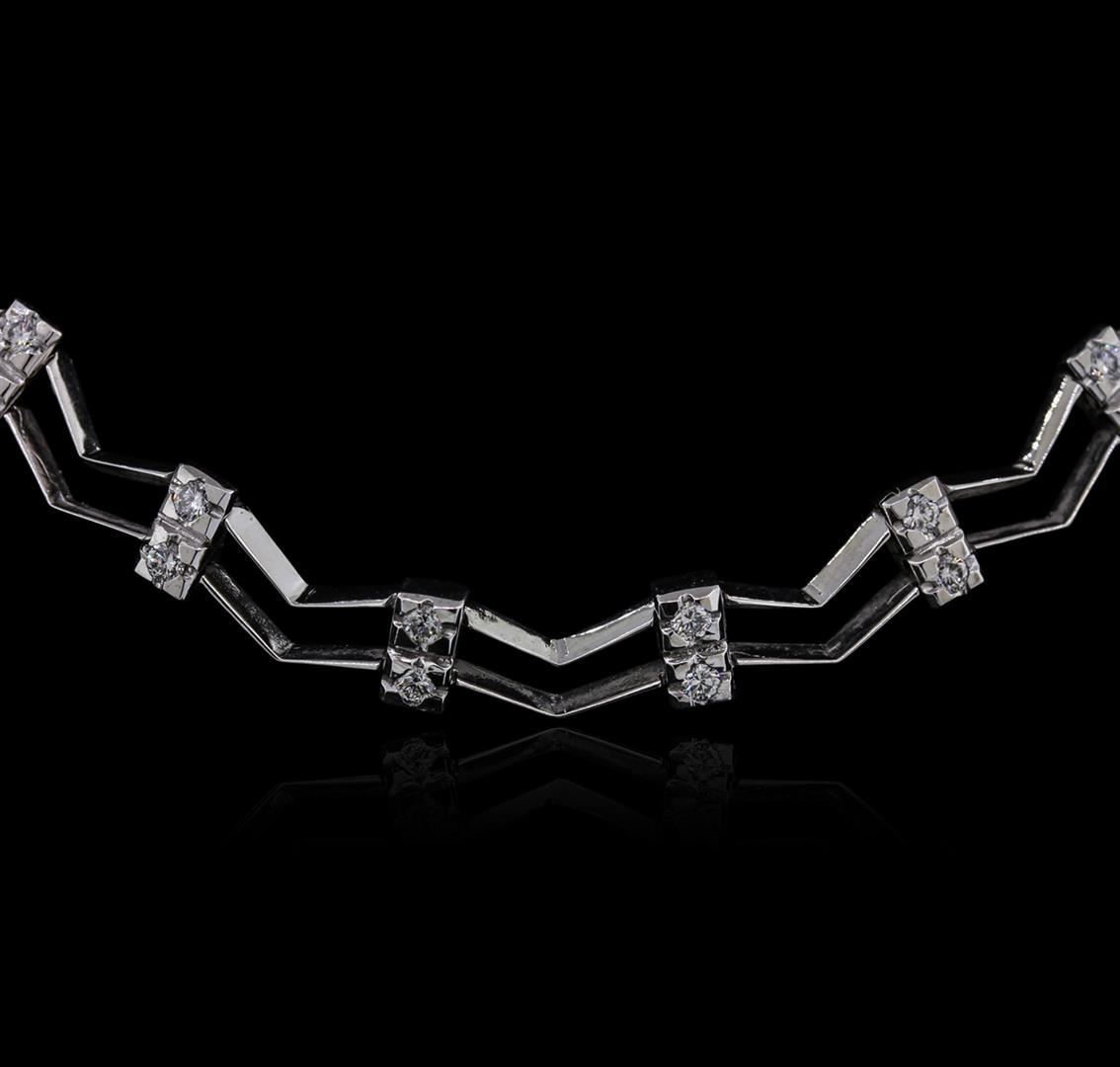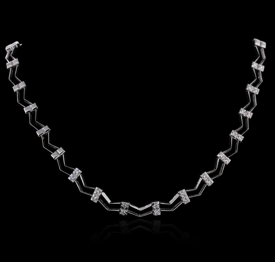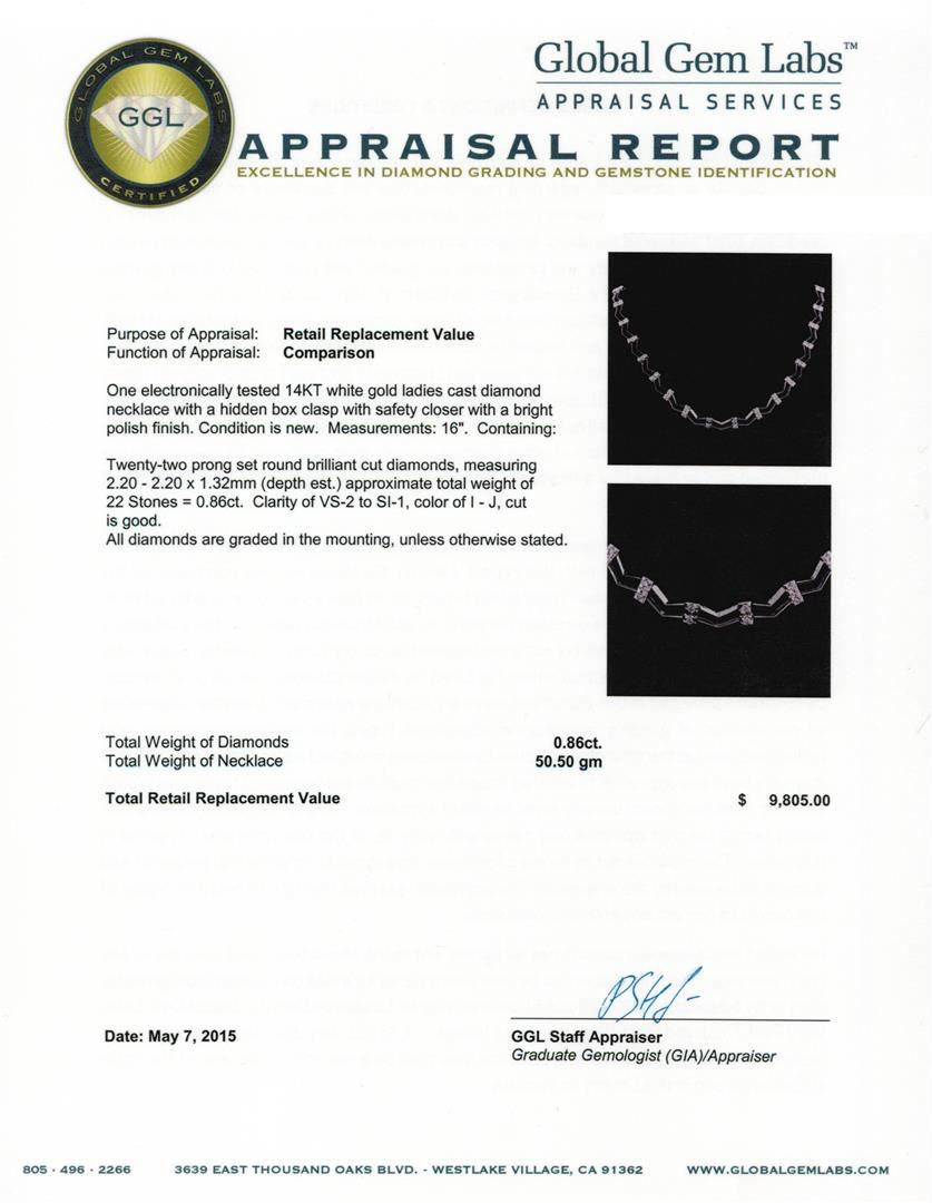One electronically tested 14KT white gold ladies cast diamond necklace with a hidden box clasp with safety closer with a bright polish finish. Measurements: 16". Condition is new. Containing: Twenty-Two prong set round brilliant cut diamonds, measuring 2.20 - 2.20 x 1.32mm (depth est.) approximate total weight of 22 Stones = 0.86ct. Clarity: VS-2 to SI-1. Color: I - J, Cut is Good. All diamonds and colored gemstones are graded in the mounting, unless otherwise stated. Total Weight of Diamonds 0.86ct. Total Weight of Necklace 50.50 grams. GGL Appraised at $9,805.00.