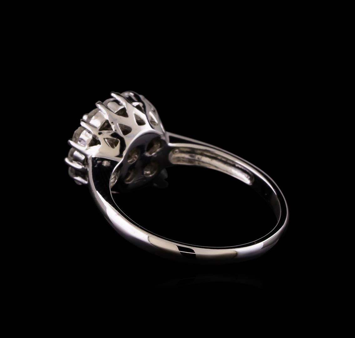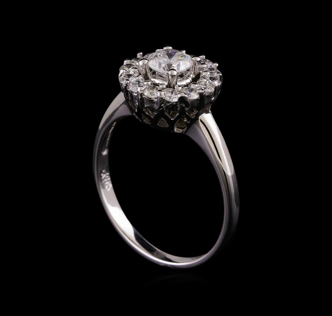 One electronically tested 14KT white gold ladies combination cast & assembled engagement ring with a flat shank with a bright polish finish. Identified with markings of "K14". Condition is new. Containing: One prong set round brilliant cut diamond, measuring 4.85 - 4.81 x 3.14mm (depth est.) approximate weight of 0.45ct. Clarity: I-1. Color: J, Cut is Good. Fourteen prong set round brilliant cut diamonds, measuring 2.00 - 2.00 x 1.20mm (depth est.) approximate total weight of 14 Stones = 0.41ct. Clarity: SI-1 to SI-2. Color: I, Cut is Good. All diamonds are graded in the mounting, unless otherwise stated. Total Weight of Diamonds 0.86ct. Total Weight of Ring 3.80 grams. GGL Appraised at $4,195.00.