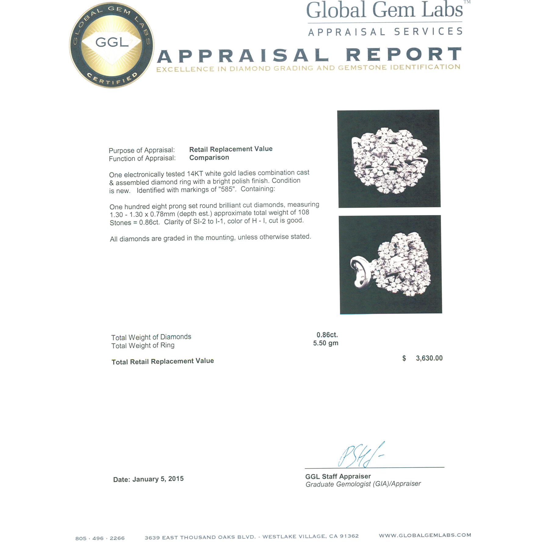 One electronically tested 14KT white gold ladies combination cast & assembled diamond ring with a bright polish finish. Identified with markings of "585". Condition is new. Containing: One Hundred prong set round brilliant cut diamonds, measuring 1.30 - 1.30 x 0.78mm (depth est.) approximate total weight of 100 Stones = 0.80ct. Clarity: SI-2 to I-1. Color: H - I, Cut is Good. All diamonds are graded in the mounting, unless otherwise stated. Total Weight of Diamonds 0.80ct. Total Weight of Ring 5.50 grams. GGL Appraised at $3,630.00.