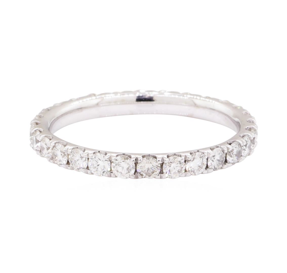 One electronically tested 14KT white gold lady's cast eternity ring with a bright polish finish. The featured lady's ring has a shank measuring 2.10 millimeters wide. Identified with markings of '14K'. Condition is new, good workmanship. Containing: Twenty-Eight prong set round brilliant cut diamonds, measuring 2.02 - 2.00 x 1.25mm (depth est.) approximate total weight of 28 Stones = 0.86ct. Graded in the setting. Color G - I, Clarity VS-2 to SI-1, Cut Very Good. Total Weight of Diamonds 0.86ct. Total Weight of Ring 1.60gm. GAS Appraised.