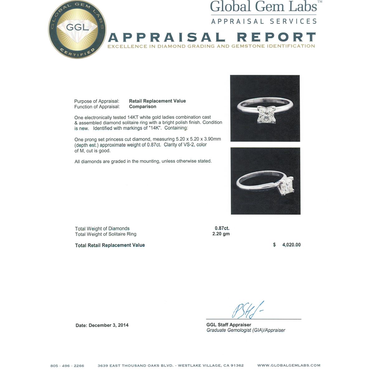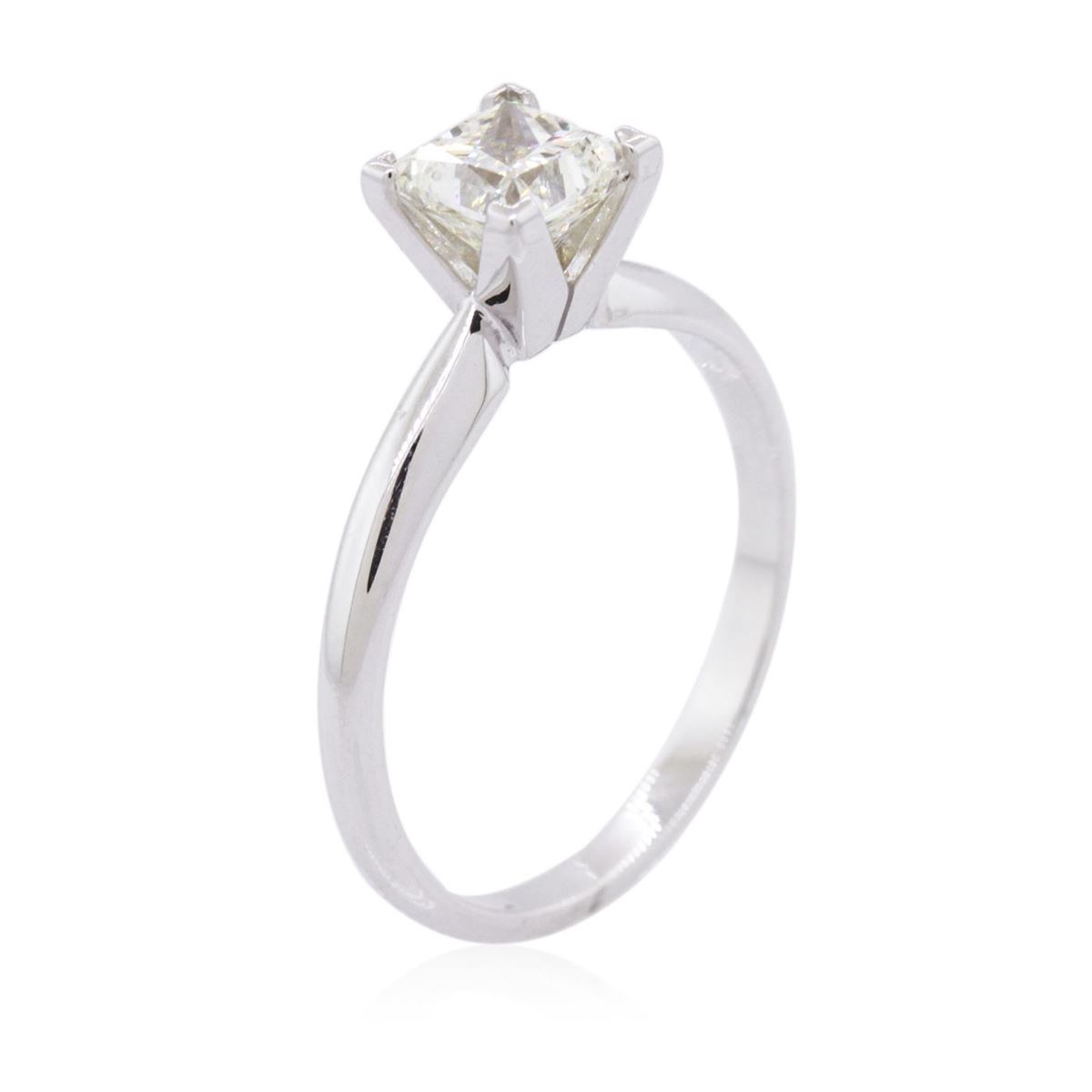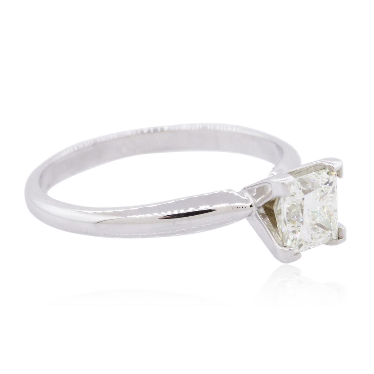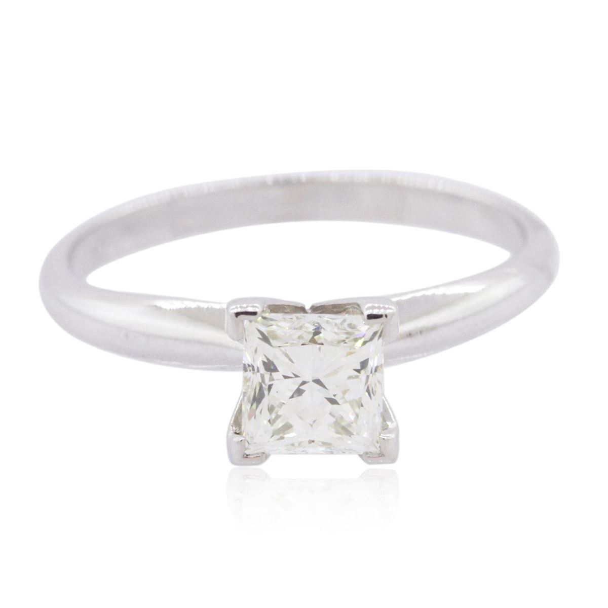 One electronically tested 14KT white gold ladies combination cast & assembled diamond solitaire ring with a bright polish finish. Identified with markings of "14K". Condition is new. Containing: One prong set princess cut diamond, measuring 5.20 x 5.20 x 3.90mm (depth est.) approximate weight of 0.87ct. Clarity: VS-2. Color: M, Cut is Good. All diamonds are graded in the mounting, unless otherwise stated. Total Weight of Diamonds 0.87ct. Total Weight of Solitaire Ring 2.20 grams. GGL Appraised at $4,020.00.