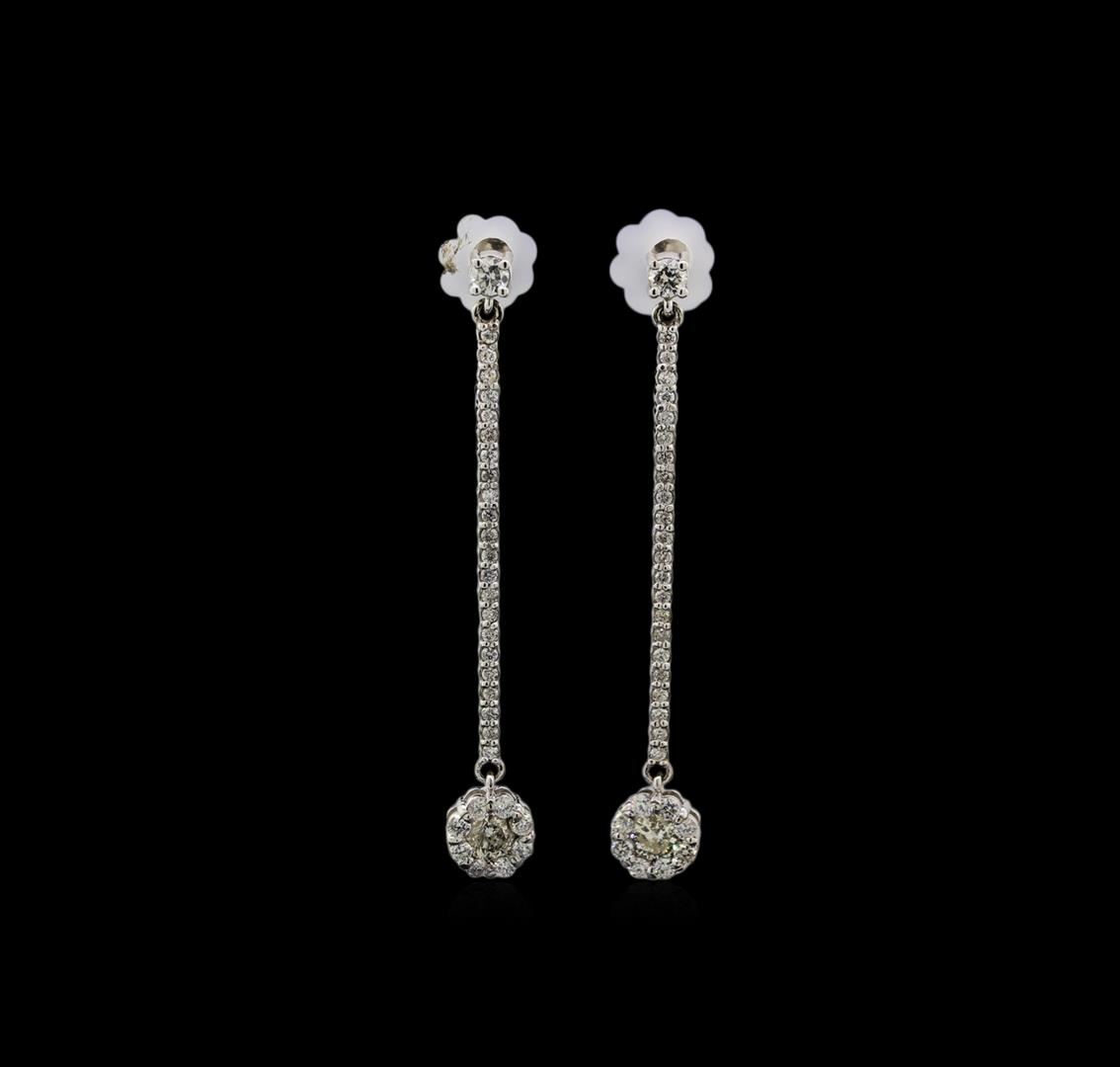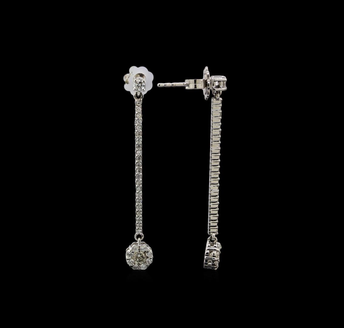One pair electronically tested 14KT white gold ladies cast diamond earrings with friction posts with a bright polish finish. Identified with markings of "585". Condition is new. Containing: Two prong set round brilliant cut diamonds, measuring 3.50 - 3.50 x 2.10mm (depth est.) approximate total weight of 2 Stones = 0.30 ct. Clarity: I-1. Color: J, Cut is Good. Sixty-Two prong set round brilliant cut diamonds, measuring 2.00 - 1.20 x 0.96mm (depth est.) approximate total weight of 62 Stones = 0.59ct. Clarity: I-1 to I-2. Color: I - J, Cut is Good. Diamonds are graded in the mounting, unless otherwise stated. Total Weight of Diamonds 0.89ct. Total Weight of Earrings 4.10 grams.
