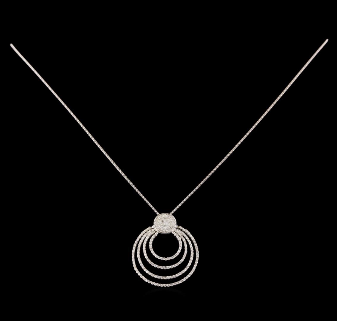 One electronically tested 14KT white gold ladies cast & assembled diamond pendant with chain. The pendant features four diamond set draping ribbons, completed by a diamond set bail. The pendant is supported by an eighteen inch length 14KT white gold designer style chain, terminating in a lobster claw clasp. Bright polish finish. Identified with markings of "K14". Condition is new, good workmanship. Containing: One Hundred Eighty-Nine prong set round brilliant cut diamonds, measuring 1.10 - 1.00 x 0.63mm (depth est.) approximate total weight of 189 Stones = 0.90ct. Graded in the setting. Clarity: I-1 to I-2. Color: G - J. Total Weight of Diamonds 0.90ct. Total Weight of Pendant With Chain 7.44 grams. AIG Appraised at $4,440.00.