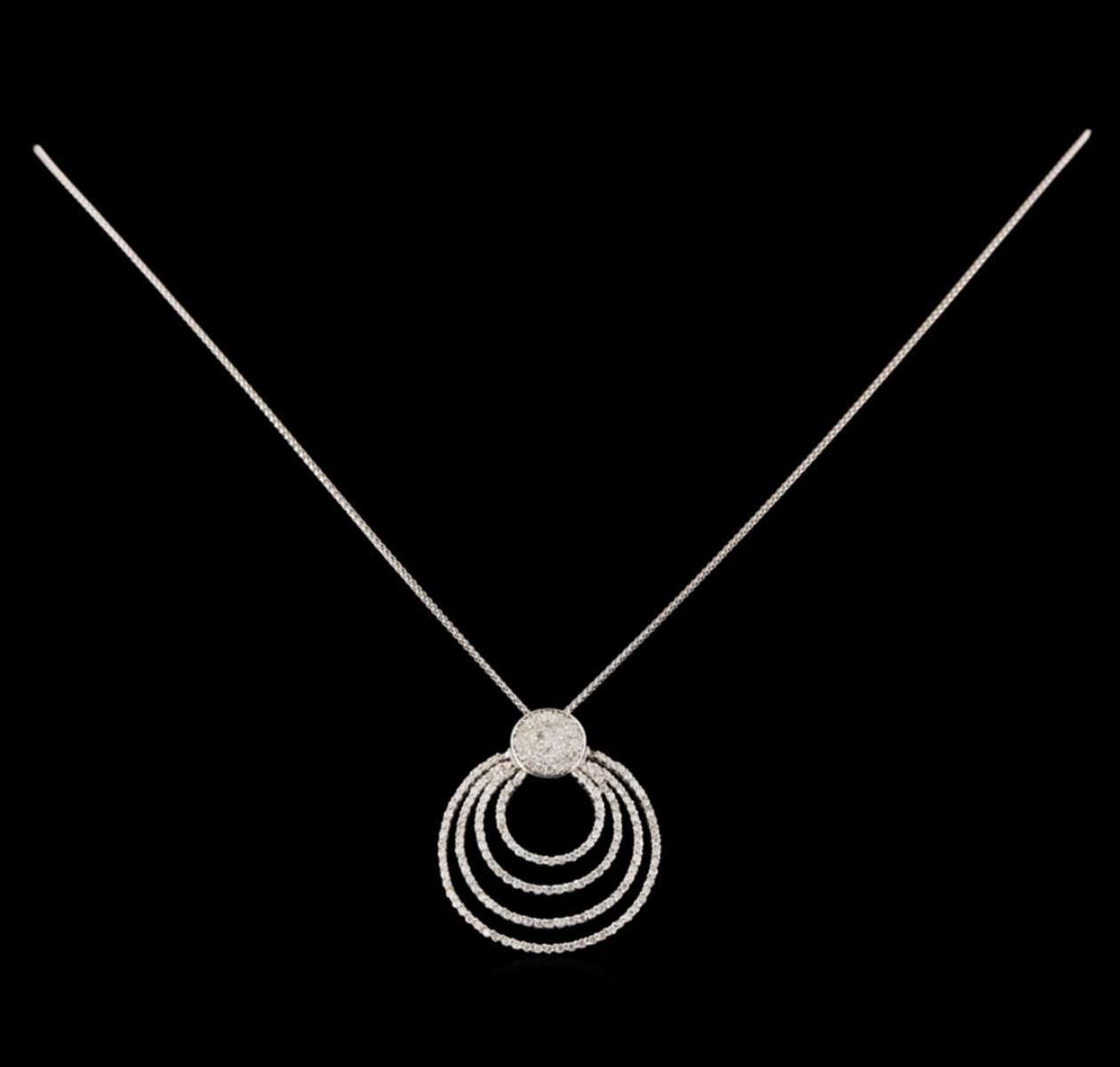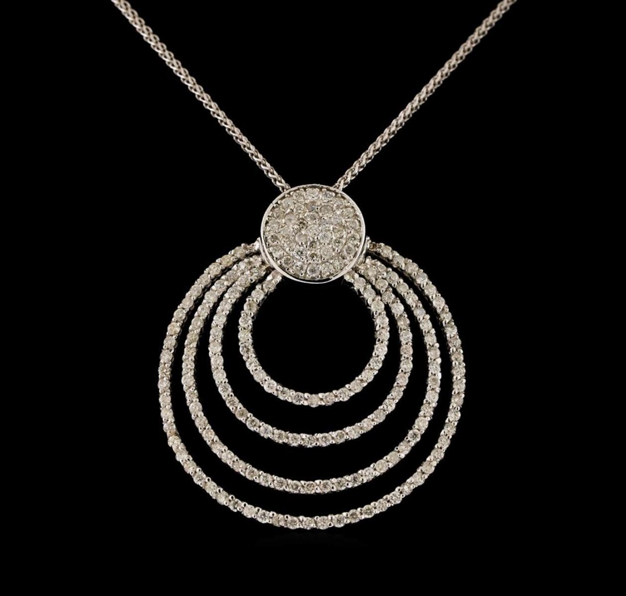 One electronically tested 14KT white gold ladies cast & assembled diamond pendant with chain. The pendant features four diamond set draping ribbons, completed by a diamond set bail. The pendant is supported by an eighteen inch length 14KT white gold designer style chain, terminating in a lobster claw clasp. Bright polish finish. Identified with markings of "K14". Condition is new, good workmanship. Containing: One Hundred Eighty-Nine prong set round brilliant cut diamonds, measuring 1.10 - 1.00 x 0.63mm (depth est.) approximate total weight of 189 Stones = 0.90ct. Graded in the setting. Clarity: I-1 to I-2. Color: G - J. Total Weight of Diamonds 0.90ct. Total Weight of Pendant With Chain 7.44 grams. AIG Appraised.