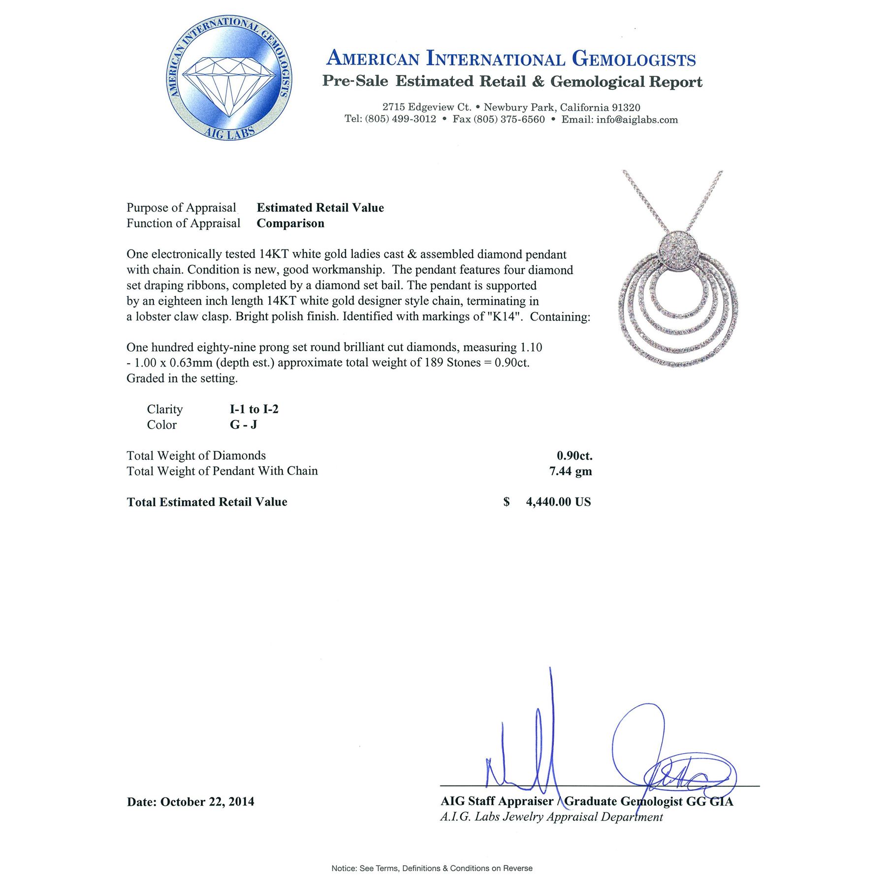 One electronically tested 14KT white gold ladies cast & assembled diamond pendant with chain. The pendant features four diamond set draping ribbons, completed by a diamond set bail. The pendant is supported by an eighteen inch length 14KT white gold designer style chain, terminating in a lobster claw clasp. Bright polish finish. Identified with markings of "K14". Condition is new, good workmanship. Containing: One Hundred Eighty-Nine prong set round brilliant cut diamonds, measuring 1.10 - 1.00 x 0.63mm (depth est.) approximate total weight of 189 Stones = 0.90 ct. Graded in the setting. Clarity: I-1 to I-2. Color: G - J. Total Weight of Diamonds 0.90 ct. Total Weight of Pendant With Chain 7.44 grams. AIG Appraised.
