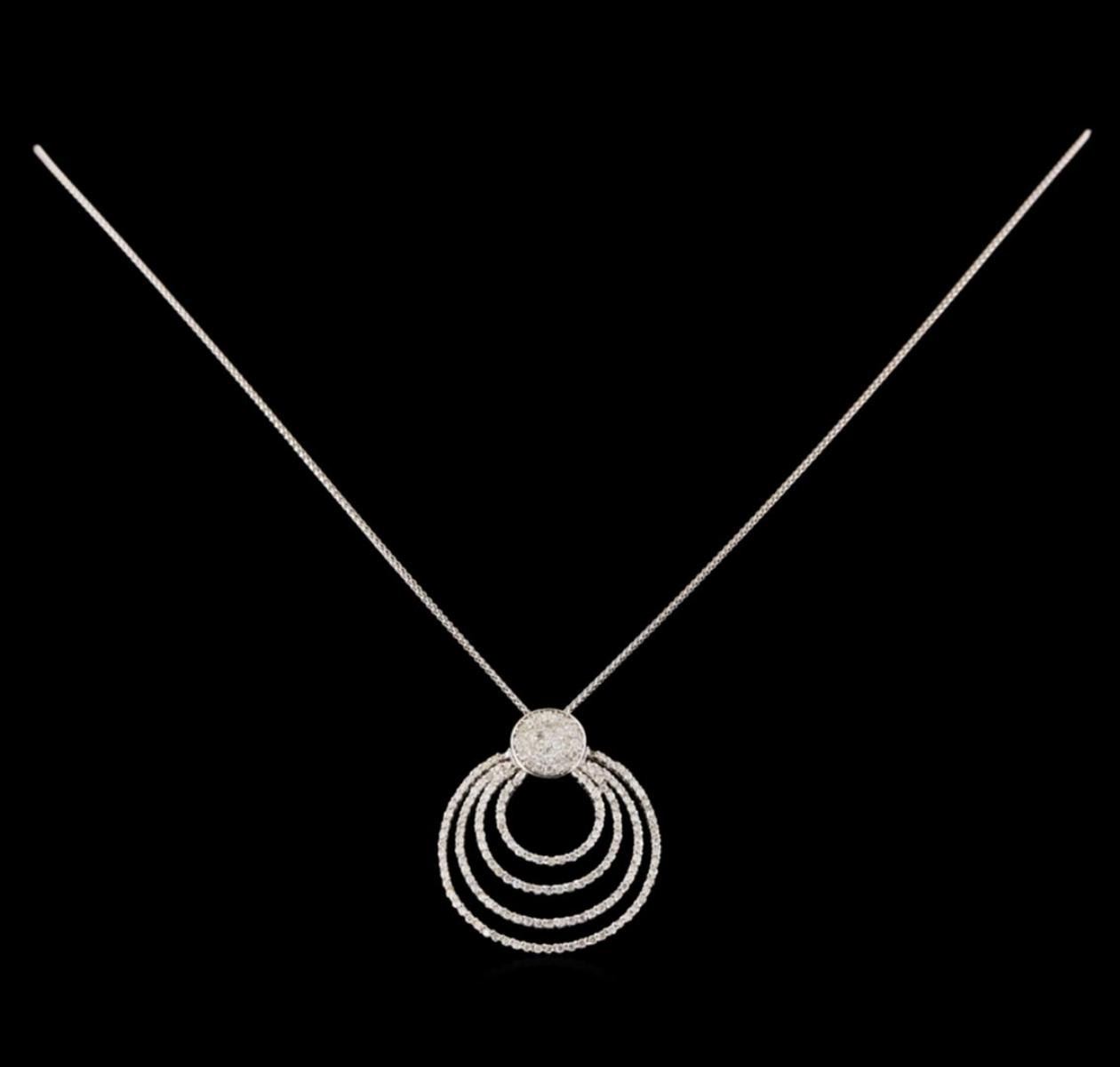 One electronically tested 14KT white gold ladies cast & assembled diamond pendant with chain. The pendant features four diamond set draping ribbons, completed by a diamond set bail. The pendant is supported by an eighteen inch length 14KT white gold designer style chain, terminating in a lobster claw clasp. Bright polish finish. Identified with markings of "K14". Condition is new, good workmanship. Containing: One Hundred Eighty-Nine prong set round brilliant cut diamonds, measuring 1.10 - 1.00 x 0.63mm (depth est.) approximate total weight of 189 Stones = 0.90 ct. Graded in the setting. Clarity: I-1 to I-2. Color: G - J. Total Weight of Diamonds 0.90 ct. Total Weight of Pendant With Chain 7.44 grams. AIG Appraised.
